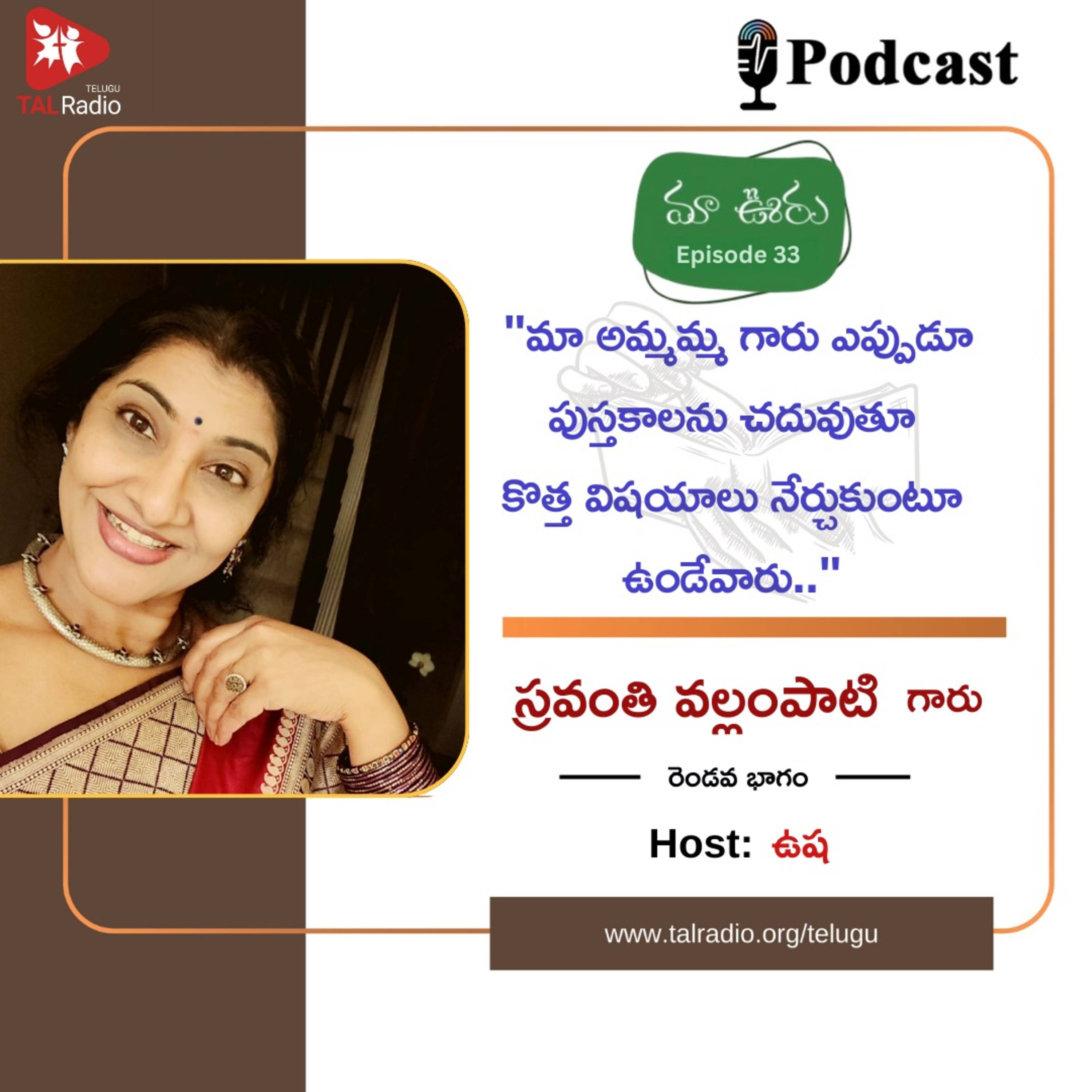 మా ఊరు కార్యక్రమంలో భాగంగా ఈ వారం కూడా స్రవంతి గారి ముచ్చట్లు విందాం . తన కాలేజీ రోజులలో జరిగిన తమాషా సన్నివేశాలు, వాళ్ళ అమ్మమ్మ గారినుండి నేర్చుకున్న విషయాలు, కుటుంబ వివరాలు, తను ఇప్పుడు చేస్తున్న పలు సామాజిక కార్యక్రమాలు.. ఇలా అన్ని విషయాలు ఈ పాడ్కాస్ట్ లో పంచుకున్నారు .
