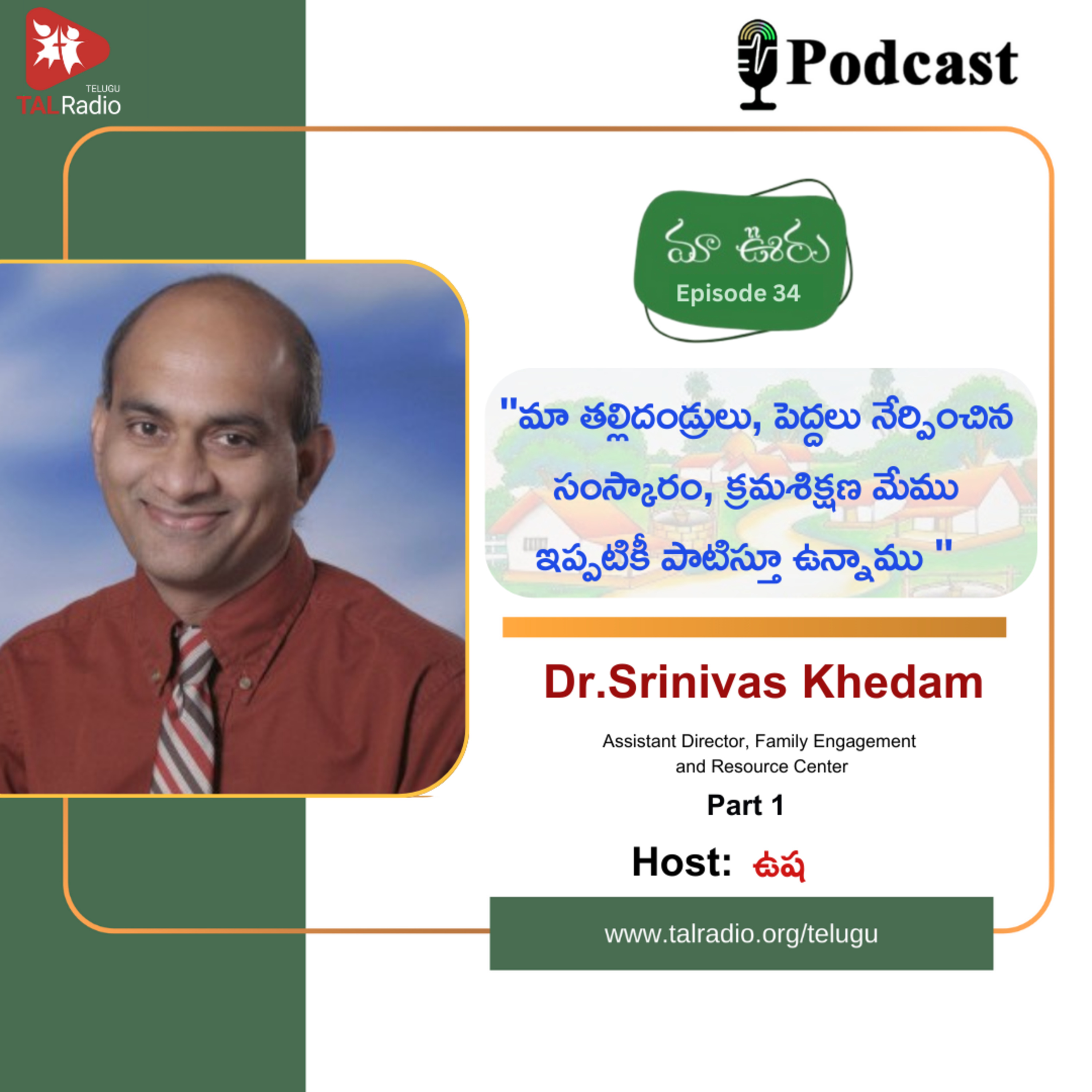 మా ఊరు కార్యక్రమంలో భాగంగా డా|| శ్రీనివాస్ ఖేదం గారిని కలుసుకుందాం. ఆయన స్వగ్రామం షాద్ నగర్. అయన పుట్టి, పెరిగింది అంతా అక్కడే.. కానీ వేసవి సెలవులు వచ్చేసరికి మైసూర్ లో ఉన్న మామయ్య గారి ఇంటికి వెళ్ళటం, మహబూబ్ నగర్ లో మామిడి తోటలకు వెళ్ళటం, సీతాఫలం పండ్ల కోసం గుట్ట కి వెళ్ళటం, బంధువులందరితో సరదాగా గడిపిన క్షణాలు.. ఇలా ఎన్నో విషయాలు మనతో పంచుకుంటున్నారు.. అంతేకాదు, అయన తల్లిదండ్రులు, పెద్దల దగ్గర నుండి నేర్చుకున్న సంస్కారం, క్రమశిక్షణ ఇప్పటివరకు పాటిస్తూనే ఉన్నాను అంటున్నారు... మరి ఆ విషయాలన్నీ ఈ పాడ్కాస్ట్ లో వినేద్దామా?