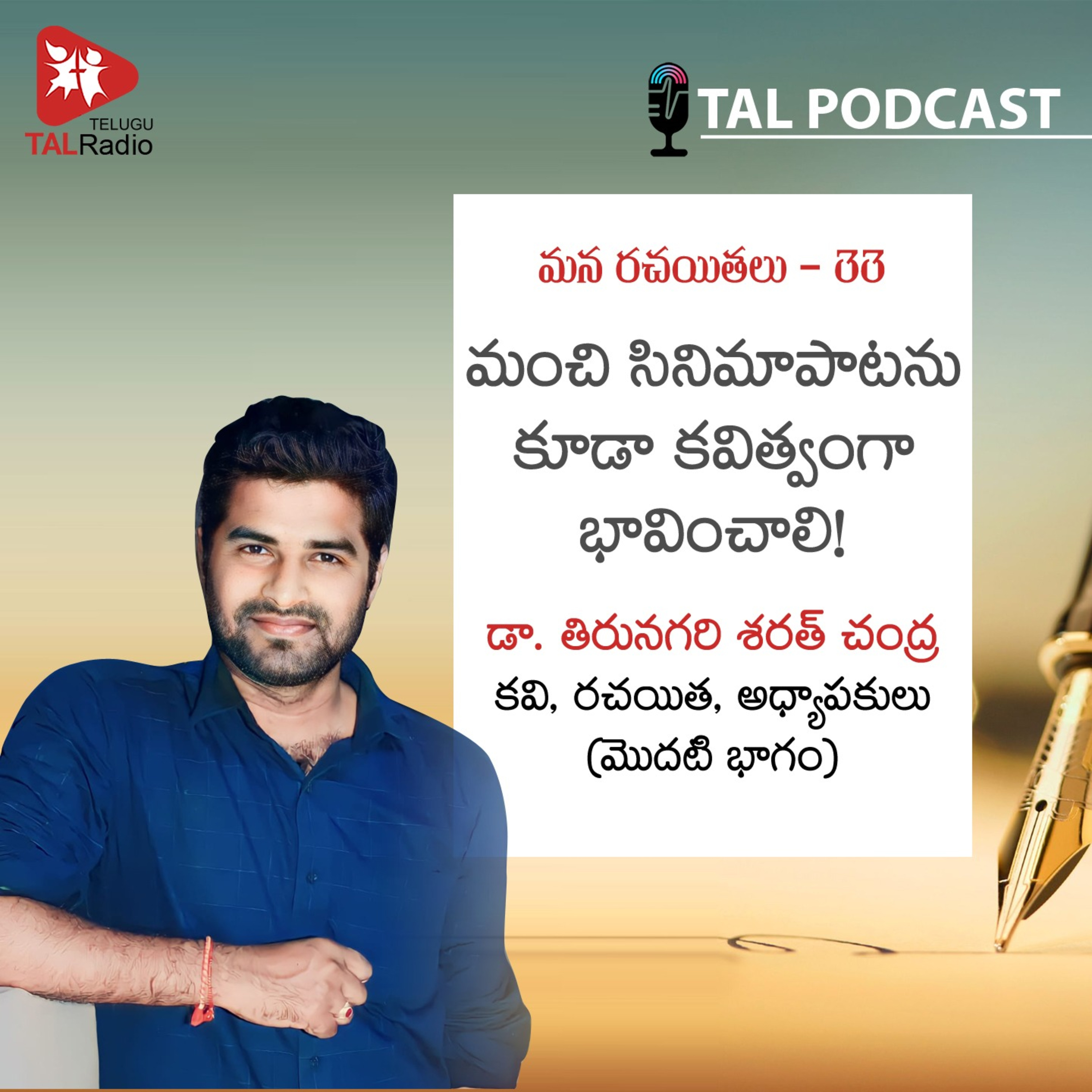 మన రచయితలు శీర్షిలో భాగంగా టాల్ పరిచయం చేస్తున్న మరో విశిష్టమైన రచయిత- తిరునగరి శరత్ చంద్ర. తండ్రి అడుగుజాడల్లో సాహిత్యంలో తొలి అడుగులు వేసిన శరత్ చంద్ర, భాష మీద మక్కువతో ఎం.ఎ తెలుగు చేసి అధ్యాపకులుగా స్థిరపడ్డారు. 'దాశరథి సినిమాపాటల్లో కవితాత్మకత' అనే ఆసక్తికరమైన అంశంపై పిహెచ్.డి చేసి డాక్టరేట్ పట్టా పొందారు. వందల కవితలు, వ్యాసాలతో పాటు సినిమా పాటలు కూడా రాసిన ఈ వర్ధమాన రచయిత మాటలు విందాం.