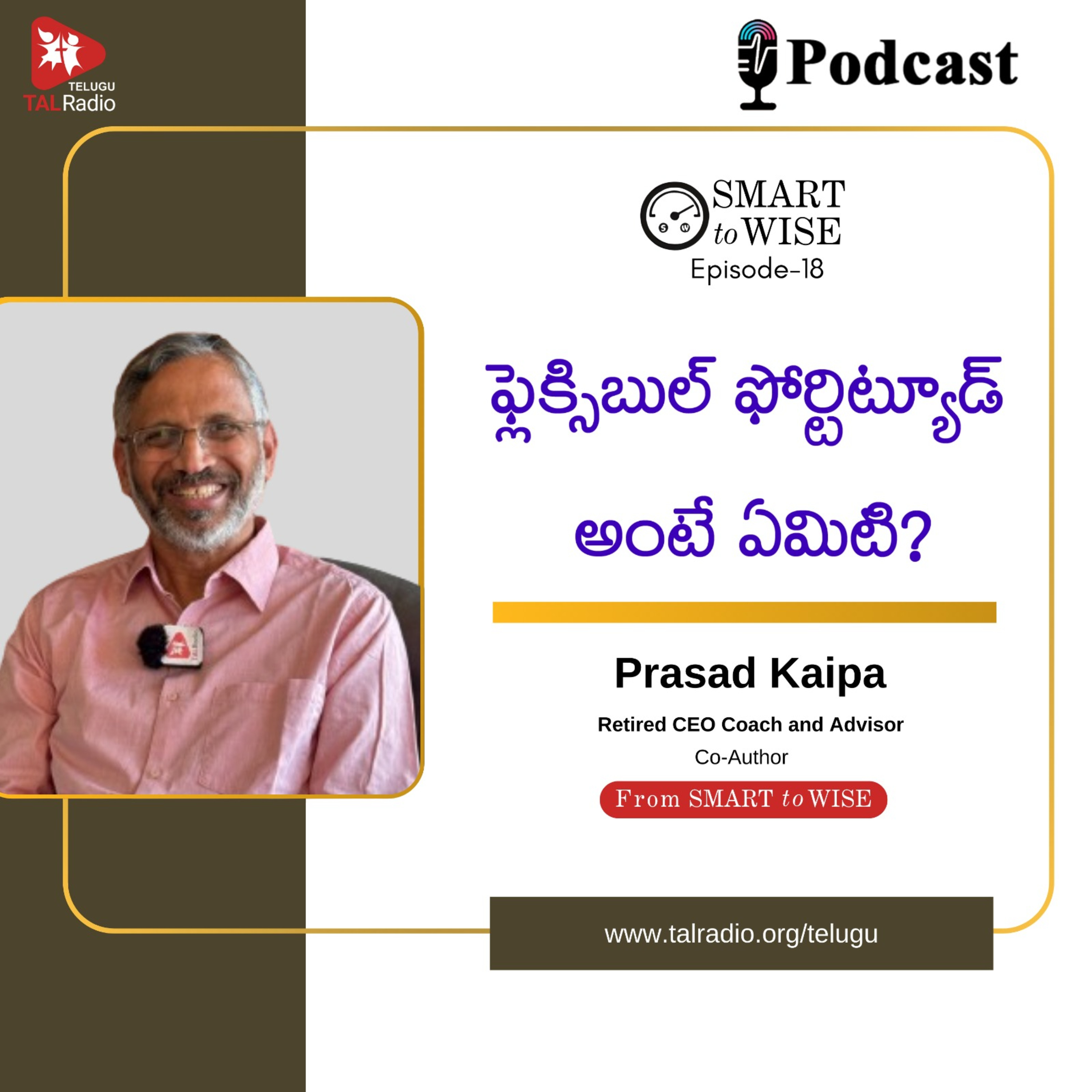 ఈ వారం Smart To Wise కార్యక్రమంలో ఫ్లెక్సిబుల్ ఫోర్టిట్యూడ్ అంటే ఏమిటి? ఈ ఫ్లెక్సిబుల్ ఫోర్టిట్యూడ్ ద్వారా మన జీవితంలో మనకు ఎదురయ్యే సమస్యలను, ప్రతికూలతలను మనం ఎలా ధైర్యంగా ఎదుర్కొని ముందుకు సాగగలం? అదేవిధంగా, ఈ ఫ్లెక్సిబుల్ ఫోర్టిట్యూడ్ ను అనుసరించకపోతే దానివలన మనకు ఎలాంటి సమస్యలు ఎదురవుతాయి? ఇలాంటి విషయాలన్నీ మన ప్రసాద్ కైప గారు ఈ పాడ్కాస్ట్ లో చాలా చక్కగా వివరించారు. మరి విందామా?