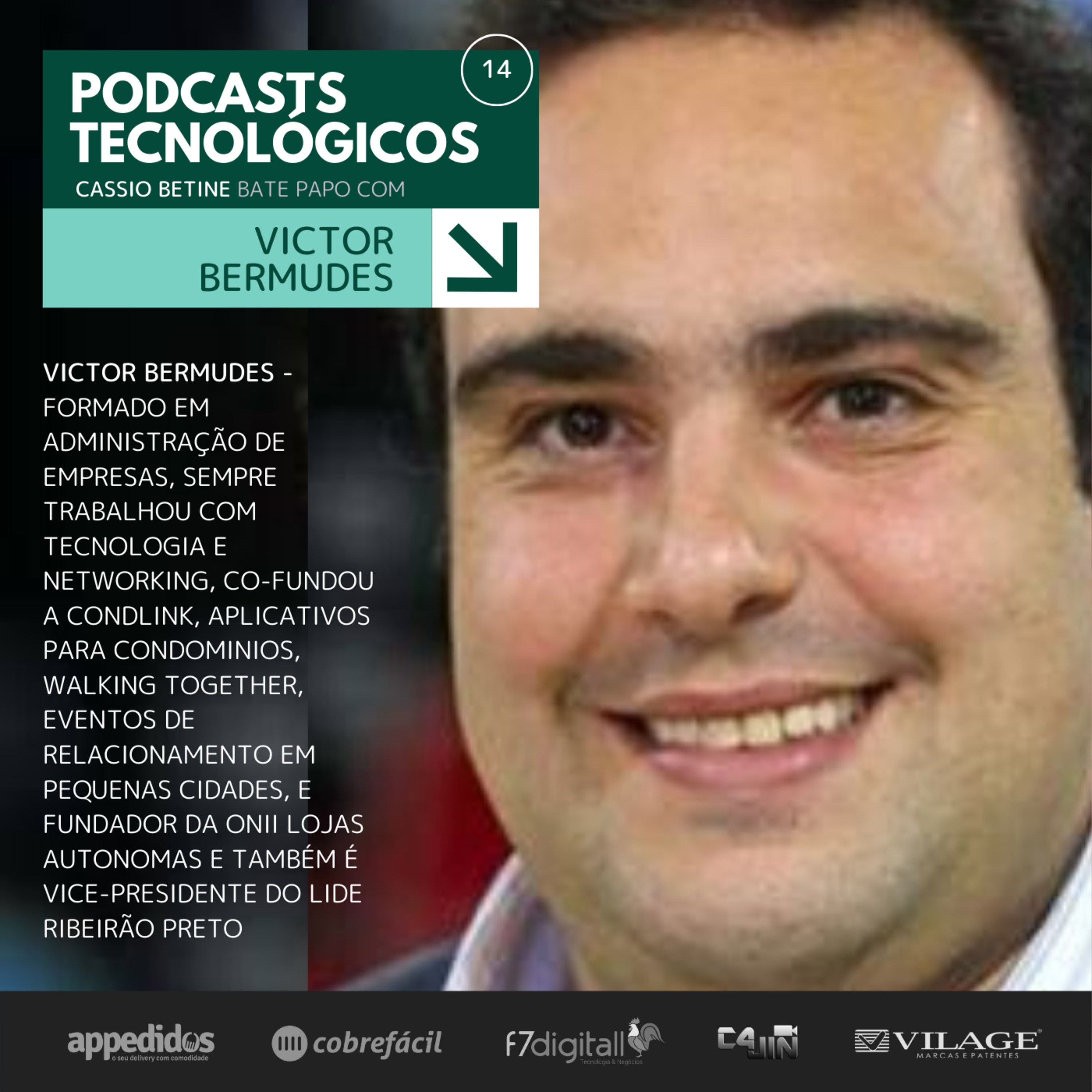 Victor Bermudes é formado em administração de empresas, sempre trabalhou com tecnologia e networking, co-fundou a Condlink, aplicativos para condominios, Walking Together, eventos de relacionamento em pequenas cidades, e fundador da Onii lojas autonomas e também é Vice-presidente do LIDE Ribeirão Preto
