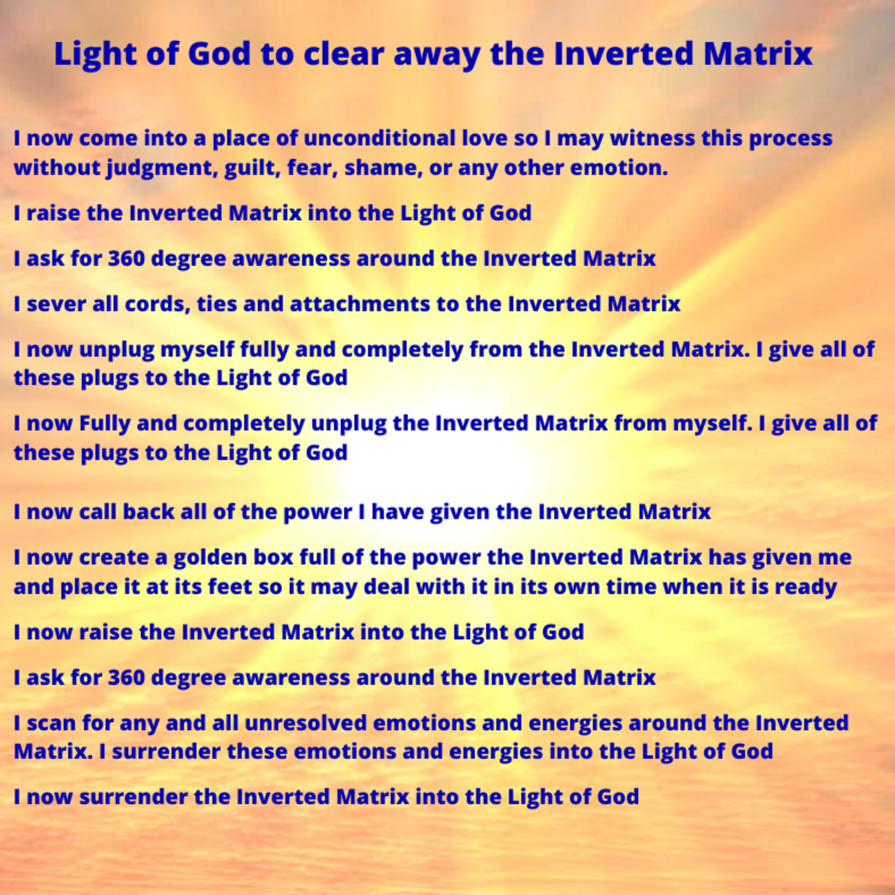Dear Friends, this is a recording of the first of two extra clearing sessions. We'll be releasing the Inverted Matrix using the Light of God process from Jason Estes. Enjoy. Suggestion is to repeat this process for 21 days and really visualize and feel the affects of each sentence. Much Love.