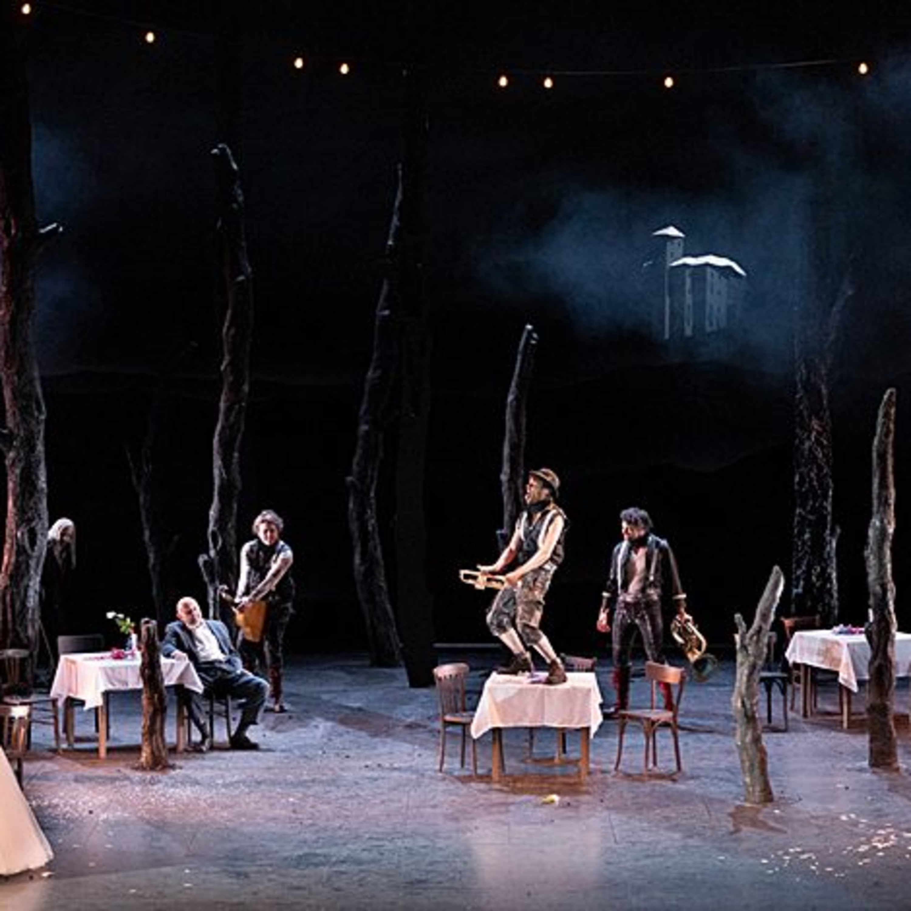 Thema des diesjährigen Opernfestivals in Lyon ist ja Familiengeheimnisse, und auch in Irrelohe dreht es sich, wie schon bei Rigoletto, um einen Familienfluch. Dieser lastet nämlich auf den Männern des Adelsgeschlechts auf Schloss Irrelohe. Jeder Mann hat einmal den Drang eine Frau zu vergewaltigen, und zwar direkt nach deren Hochzeit. Quasi als vom Fluch auferlegtes Jus primae noctis… Heinrich allerdings kämpft, von Familiendämonen verfolgt, dagegen an, vertieft sich in Bücher und offenbar auch in die Pflanzenzucht. Mit Peter stellt sich allerdings ein weiterer Nachfahre heraus, der als Sohn der „ehemals feschen“ Lola aus einer früheren Vergewaltigung hervorgegangen ist. Dazu kommt Christobald der eigentliche Bräutigam Lolas, der nach der Vergewaltigung verschwunden ist und nun 30 Jahre später plötzlich wieder auftaucht. 30 Jahre, in denen er sich zum Feuerteufel entwickelt hhat, denn nur durch das Feuer sind Reinheit und Ordnung wieder zu erreichen. Und dann ist da noch die junge Förstertochter Eva, die unschudige Reine. Sie will, all den überlieferten Irreloher Geschichten zum Trotz Heinrich heiraten. Es ist eine vertrackte Geschichte, die damit endet, dass das Schloss in Flammen steht, als in irrer Lohe (!). An sich würde das, durch die kathartische Wirkung des Feuers den Weg für eine gemeinsame Zukunft Evas und Heinrichs ebnen, doch nimmt sich Eva überraschend das Leben und lässt so das, trotz aller Tragik erwartete, happy end nicht zu.