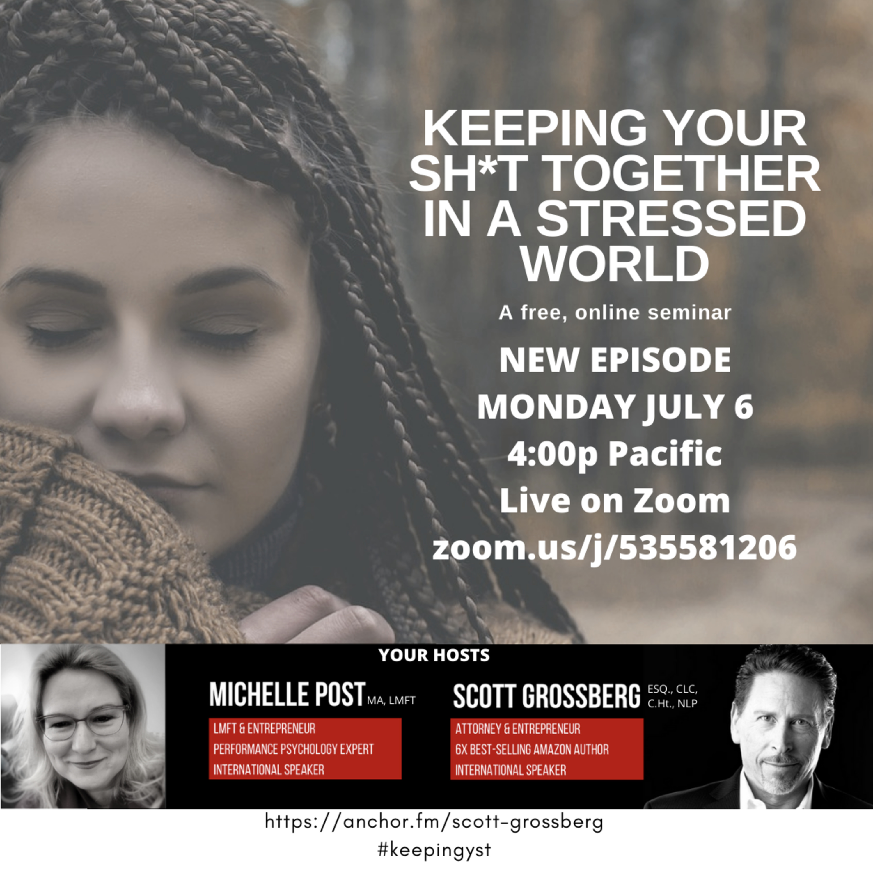 Join Michelle Post, MA, LMFT, and Scott Grossberg, Esq., CLC, C.Ht., NLP for 45 minutes of raw, irreverent, and results-oriented discussion with one purpose in mind . . . to help you cope, thrive, and survive the craziness that's going on in the world.