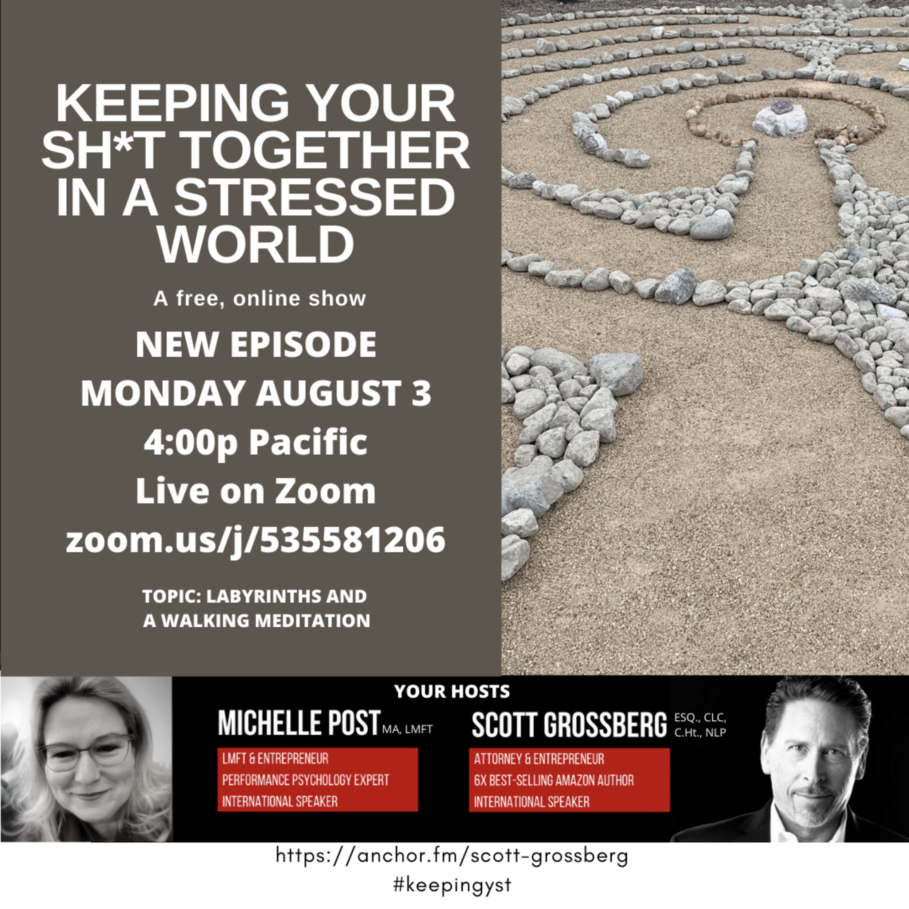 Join Michelle Post, MA, LMFT, and Scott Grossberg, Esq., CLC, C.Ht., NLP for 45 minutes of raw, irreverent, and results-oriented discussion with one purpose in mind . . . to help you cope, thrive, and survive the craziness that's going on in the world. In this episode, Michelle and Scott discuss labyrinths and walking meditations. The tools in this episode will help you find your balance and a new place of wellbeing.