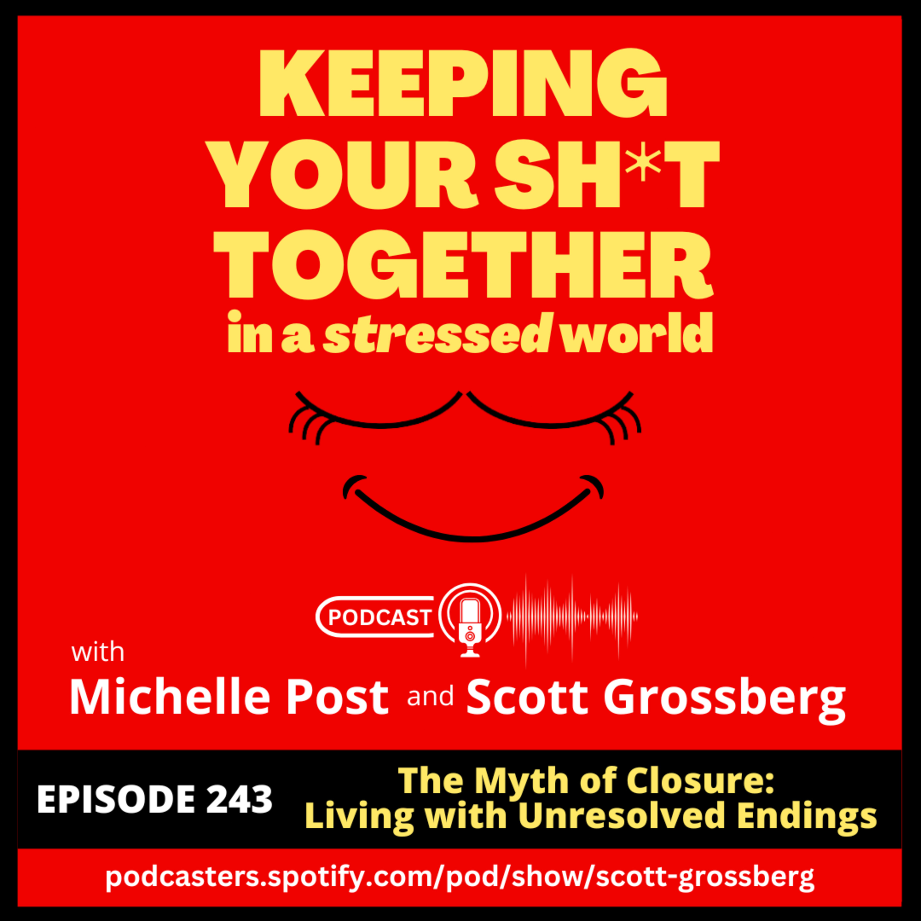 Keeping Your Sh*t Together in a Stressed World is a podcast hosted by Michelle Post, MA, LMFT and Scott Grossberg, JD, CLC, CCH, NLP, and is 30 minutes of raw, irreverent, and results-oriented discussion with one purpose in mind . . . to help you cope, thrive, and survive the craziness that's going on in the world.