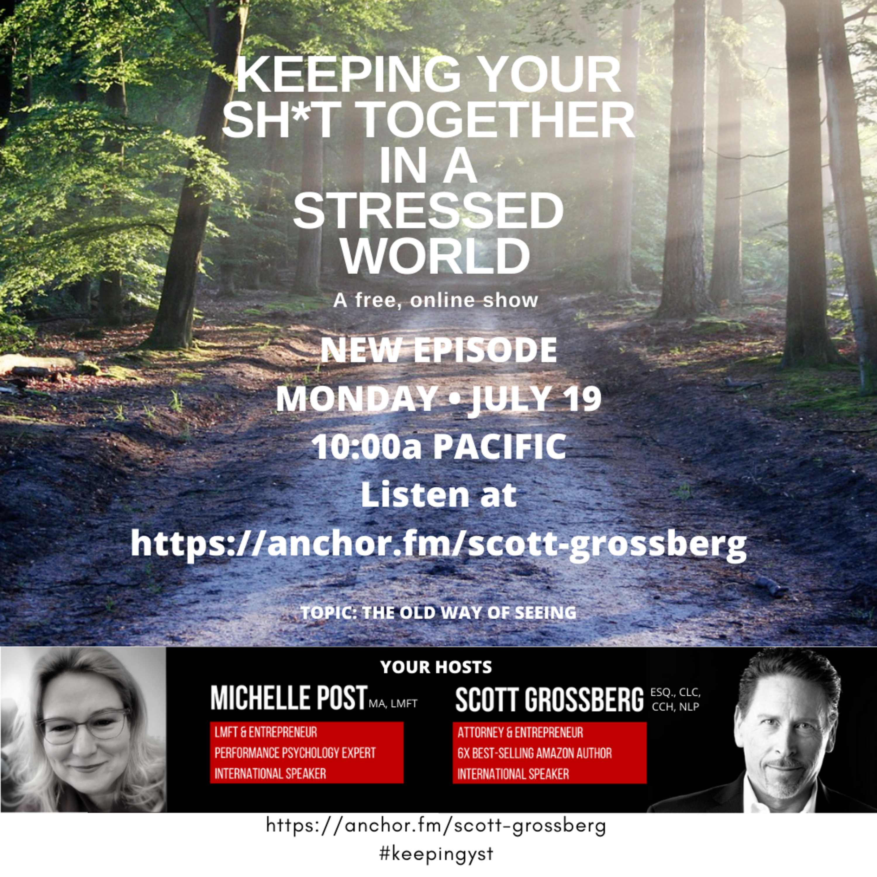 Keeping Your Sh*t Together in a Stressed World is a podcast hosted by Michelle Post, MA, LMFT and Scott Grossberg, Esq., CLC, CCH, NLP and is 45 minutes of raw, irreverent, and results-oriented discussion with one purpose in mind . . . to help you cope, thrive, and survive the craziness that's going on in the world.