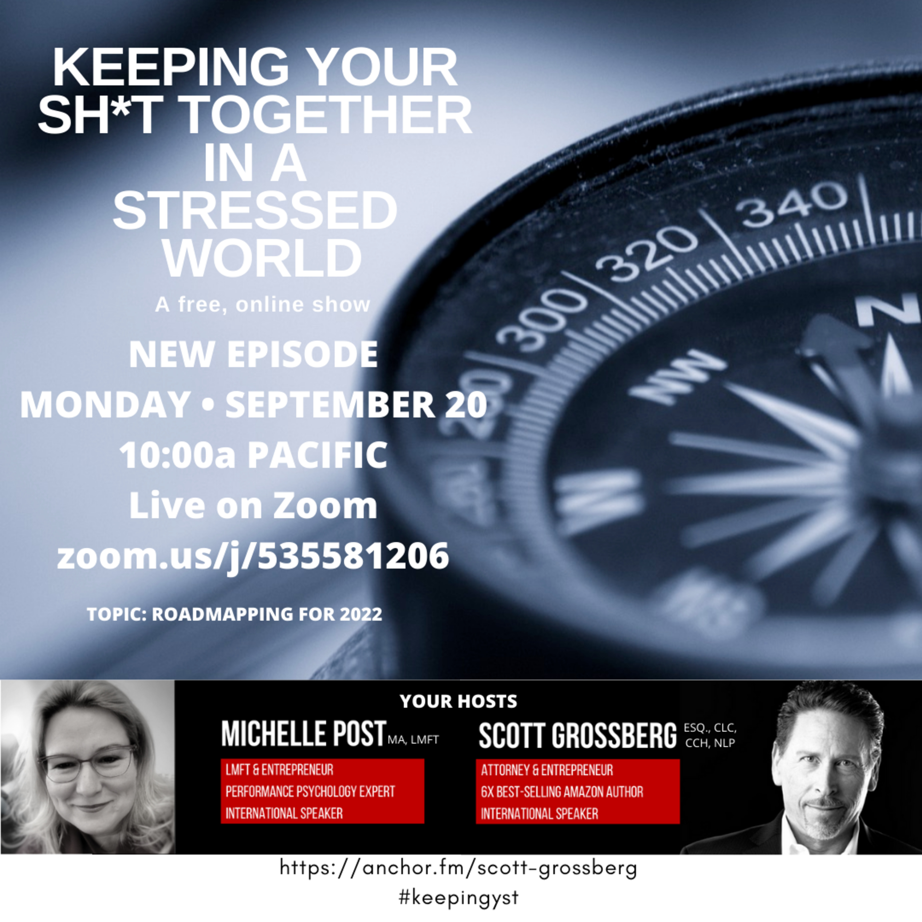 Keeping Your Sh*t Together in a Stressed World is a podcast hosted by Michelle Post, MA, LMFT and Scott Grossberg, Esq., CLC, CCH, NLP and is 45 minutes of raw, irreverent, and results-oriented discussion with one purpose in mind . . . to help you cope, thrive, and survive the craziness that's going on in the world.