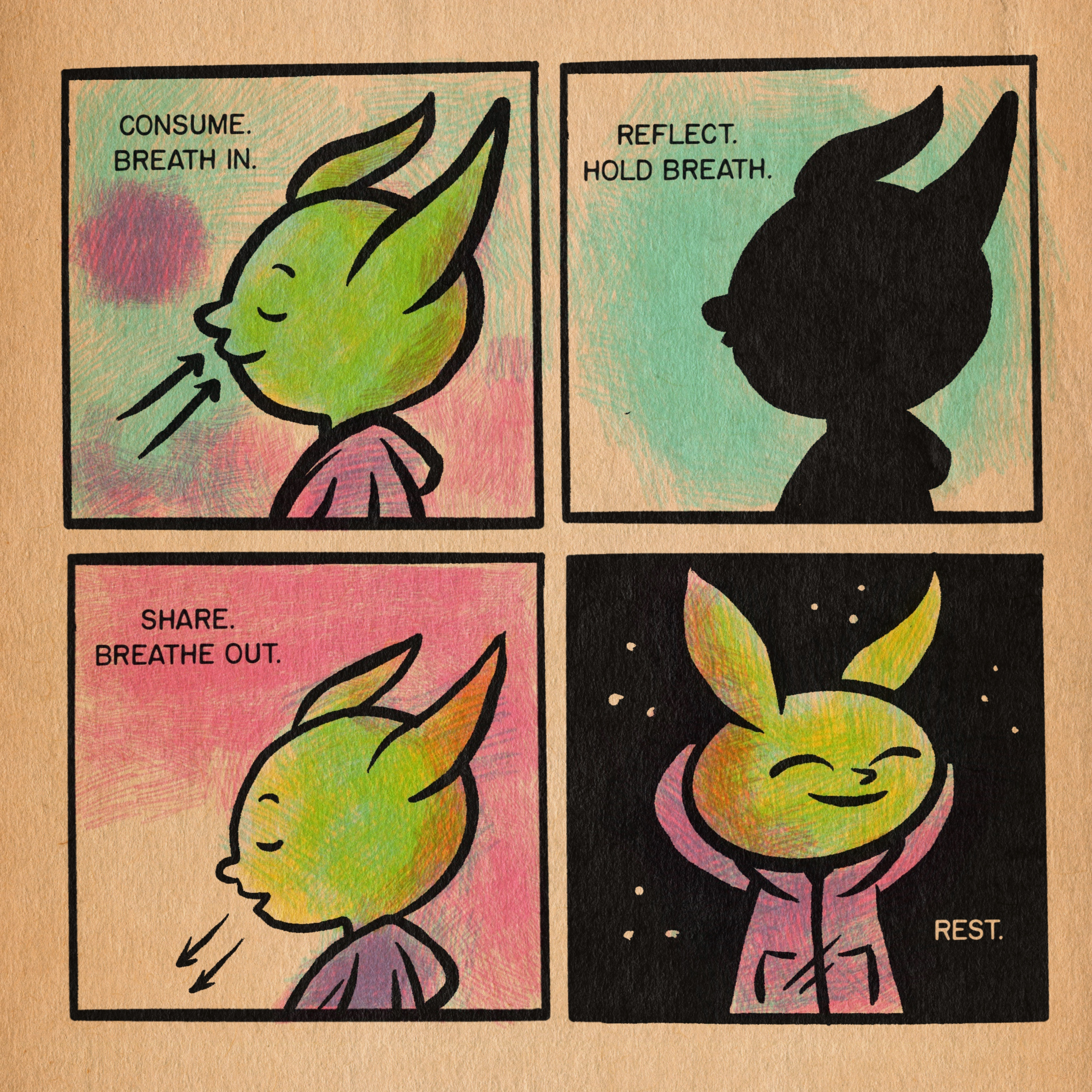 An update to an older goblin comic about a little breathing exercises I like to do through out the day. Breathing seams to reflect what we do as weirdo humans in the way we consume (breath in) reflect (hold breath) and share (exhale) on a daily basis. I hope y'all have a wonderful Monday!