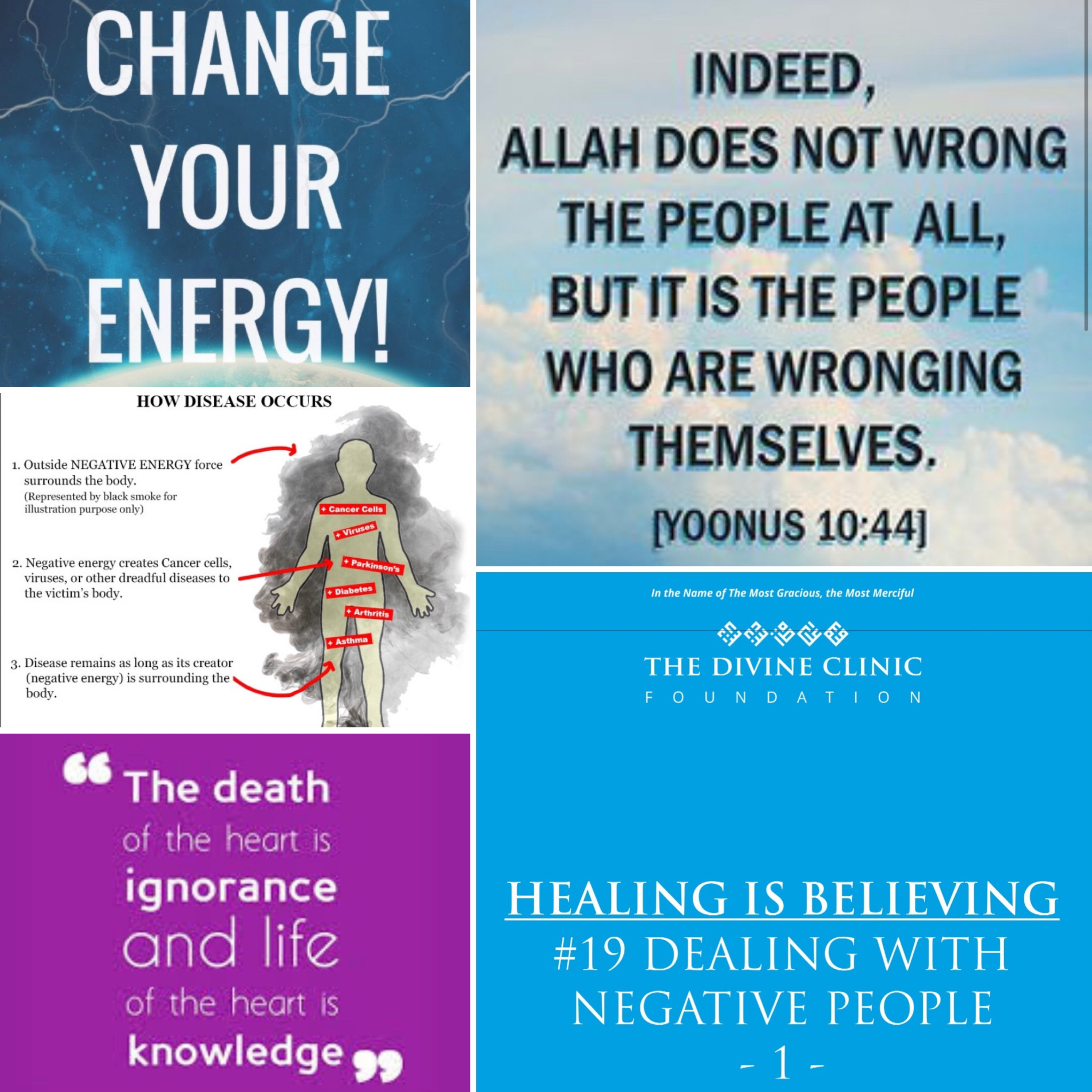 Just launched our 19th episode of Healing is Believing podcast series. Today’s discussion with QW, Imaam Saab and Dr Isa White Muhammed dissects Dealing with Negative People. We need to examine in understanding emotion it is energy and we are beings of energy on a molecular level. Some people emit more negative energy more than others. This is why those who are spiritually infused can feel the heaviness of the negative person’s energy. If you don’t understand the bad energy and you feel the person may be doing bad things to you it will play with your mind. Satan will not enter the mind unless you allow it. Ultimately it is you who can take the negativity to the heart. then this possesses greater danger causing a personal imbalance. There is a great need of humanity at large in being spiritually balanced first and then one can understand how negative energy affects us. We need to stand for the truth and if we become emotionally receptive to everything we become reactive and draw in more negative energy to ourselves. There are many people who claim to be spiritual healers and tell people stories to sway one and create doubt in swaying their minds. Once doubt penetrates the mind it grows like bacteria and it contaminates the self as the very existence of doubt causes agitation and affects the heart. The side effects is one then decides to take revenge. Basically what we are saying is don’t be reactive. If you think someone is hurting you - connect with the Divine Clinic Foundation to help in understanding the negativity you are experiencing deeper. The truth is the only thing that awakens the heart for surely speaking the word of God is the unequivocal truth. To understand the element of truth you have to find the ones who are committed towards the salvation of you, salvation of mankind and willing to be truthful at all costs. You have to find the "Isa" that is stern on God’s message. Once you find them then you have to deal with the truth because cleansing means breaking the negativity and its tough and rough. Just like the liquid castor oil no one likes to ingest during a body cleanse but its purpose is to cleanse the body from toxicities. The ones of you are feeling negative you need to ask are you willing or ready to change your life and be much more fluent and fluid? It is important to seek not only spiritual councillors but even greater is the understanding of the essence of the message in why a spiritual life is necessary in our time. #actionsspeaklouderthanwords #seeingisknowing #feelingisbelieving #saveasoulsavehumanity #thedivineclinicfoundation