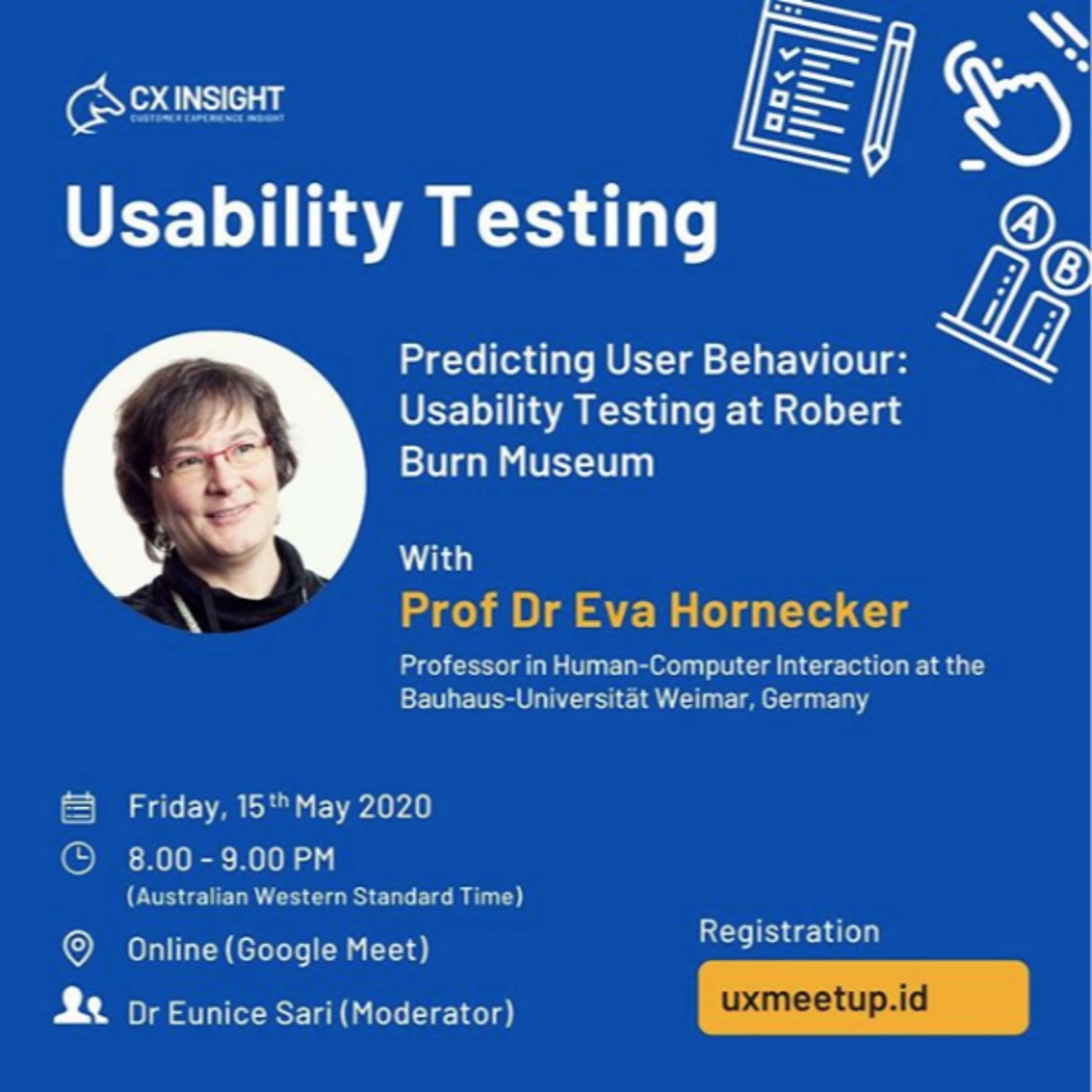 Dr Eva Hornecker, Sebagai Professor Human-Computer interaction di Bauhaus-Universitat Weimar, Germany Berbicara tentang Predicting User Behaviour: Usability Testing pada Robert Burns Museum, dimana dia menggambarkan kepada kita untuk mengetahui dan memprediksi tentang perilaku pengguna. Diselenggarakan di google meet (Online UX Indonesia meetup, pada 15 may 2020)