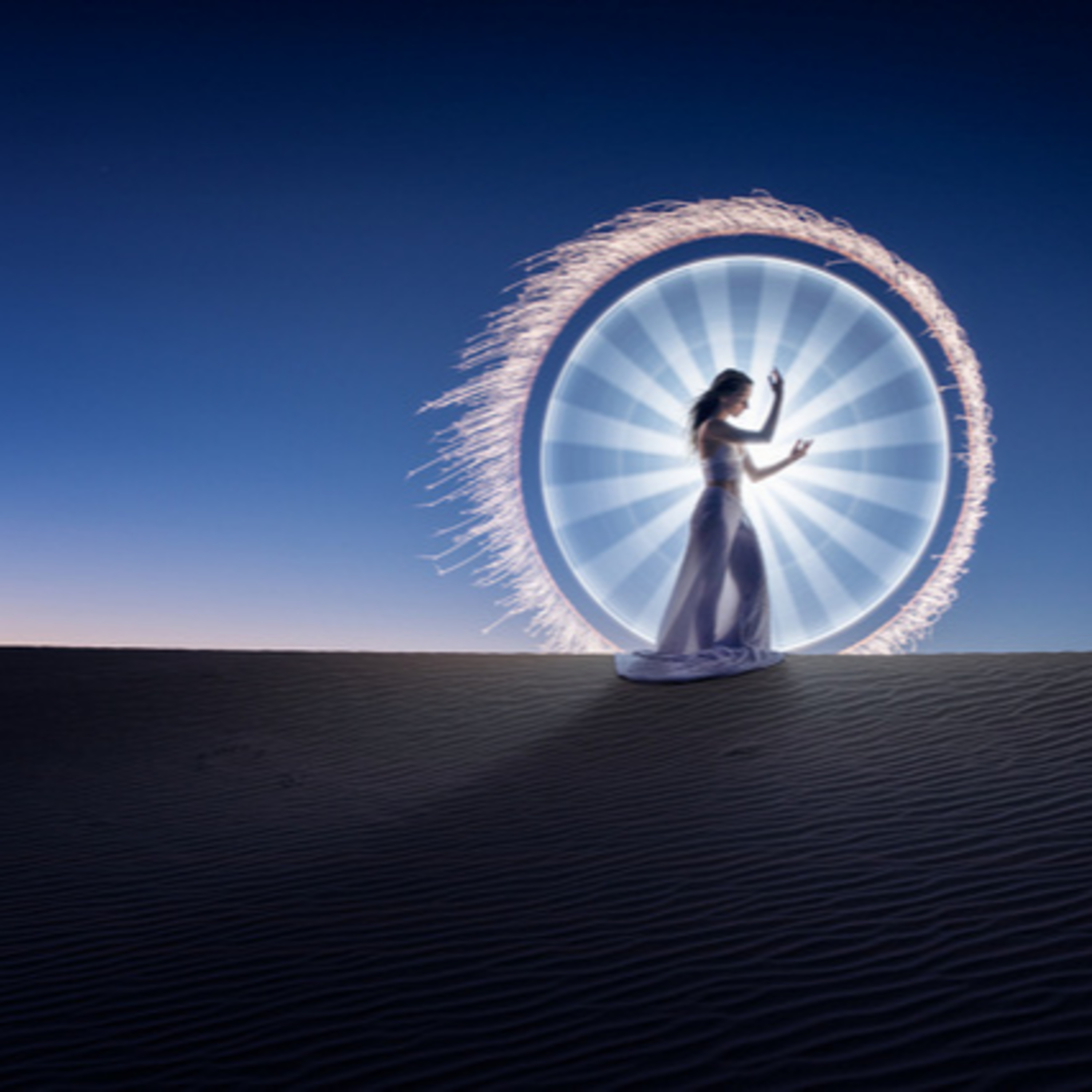 “We’re using a four foot tube, it’s a plastic tube and I put a flashlight inside of it. I go behind Kim and I simply make some movements with my light tube during a long exposure shot.”