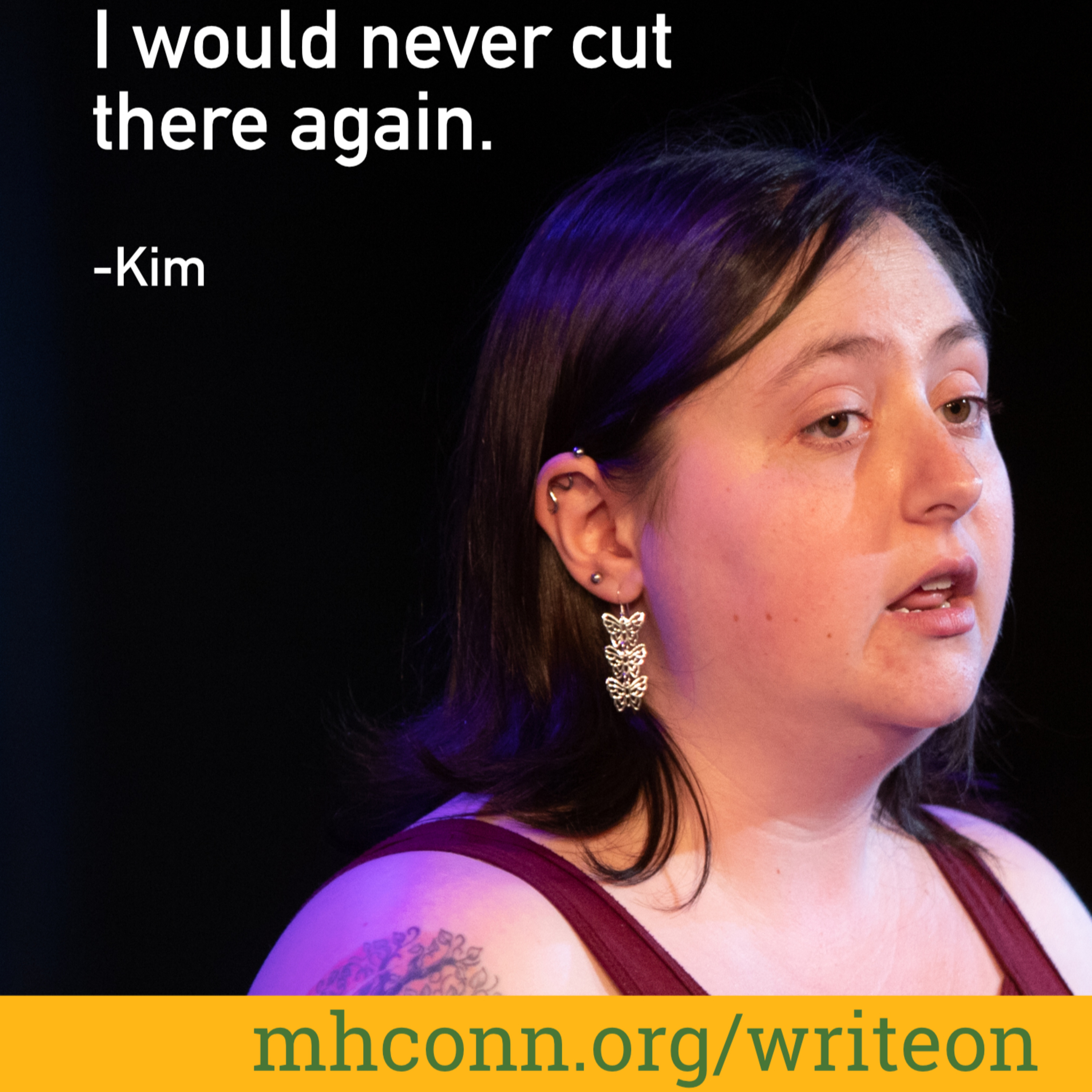 The following story is told by Kim, a writer and mental health advocate from MHC's Write On! program. This story is raw, personal, and may contain language not suitable for all listeners. To view this in video format (with captions) visit www.mhconn.org/WriteOn.