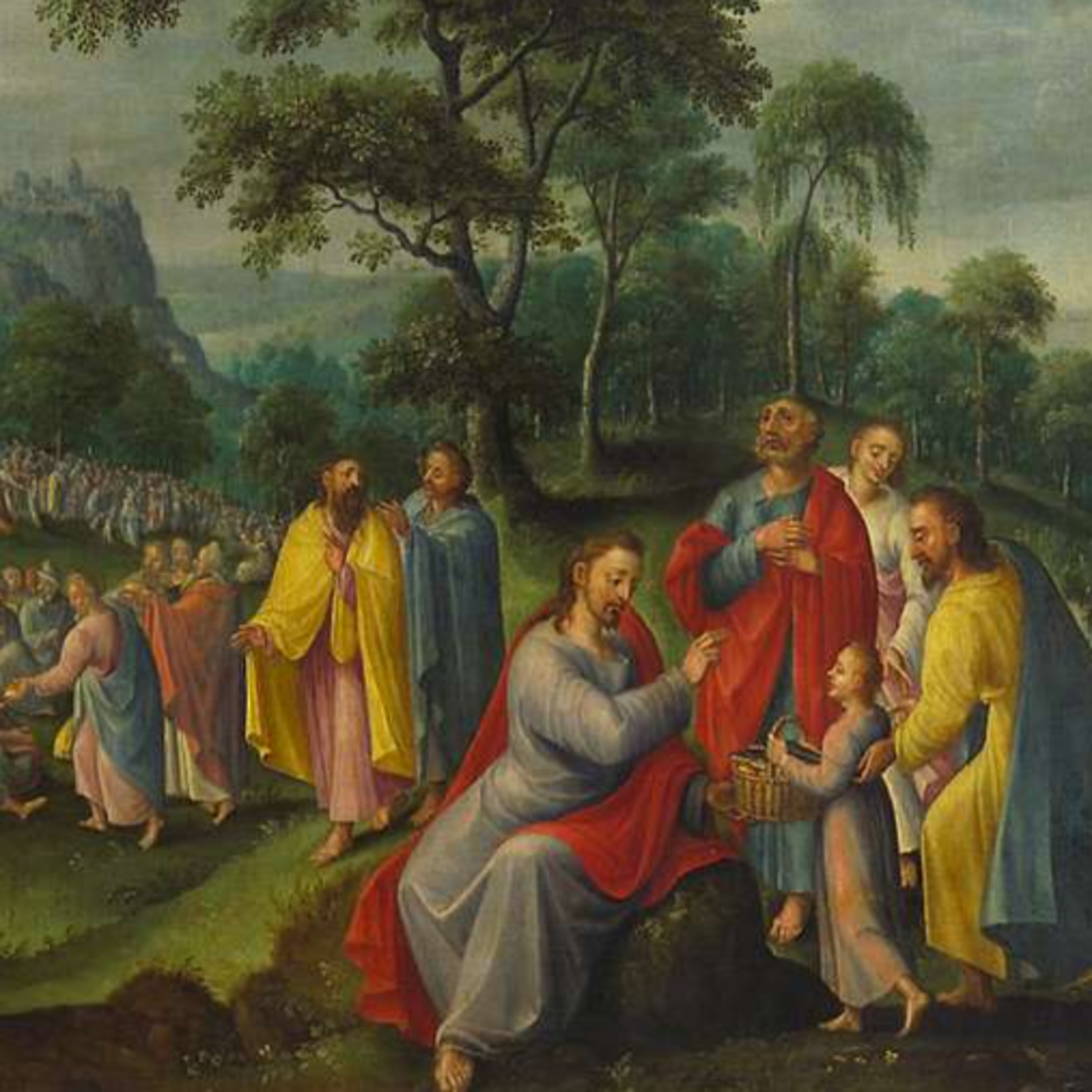 Late in the day, Jesus sees the vast crowd following him like sheep without a shepherd. Moved with pity for them, he begins teaching them when the disciples approach him and ask Jesus to dismiss the crowd so they can go to nearby villages to find something to eat. He tells them, "Give them some food yourselves." When the disciples tell him that it would be impossible to buy the amount of food needed, Jesus asks how many loaves there are. Taking the five loaves they give him, Jesus prays, says a blessing, and breaks the loaves and fishes. At this, Mark simply says, "They all ate and were satisfied." After they ate, the disciples picked up twelve wicker baskets full of fragments from the crowd of five thousand. Why does Jesus tell the disciples to give the crowd some food themselves? It seems in that question, he is teaching the disciples to rely not on themselves but on the word of God, as we hear in the Gospel according to John, when he says, "I have food to eat of which you do not know."
