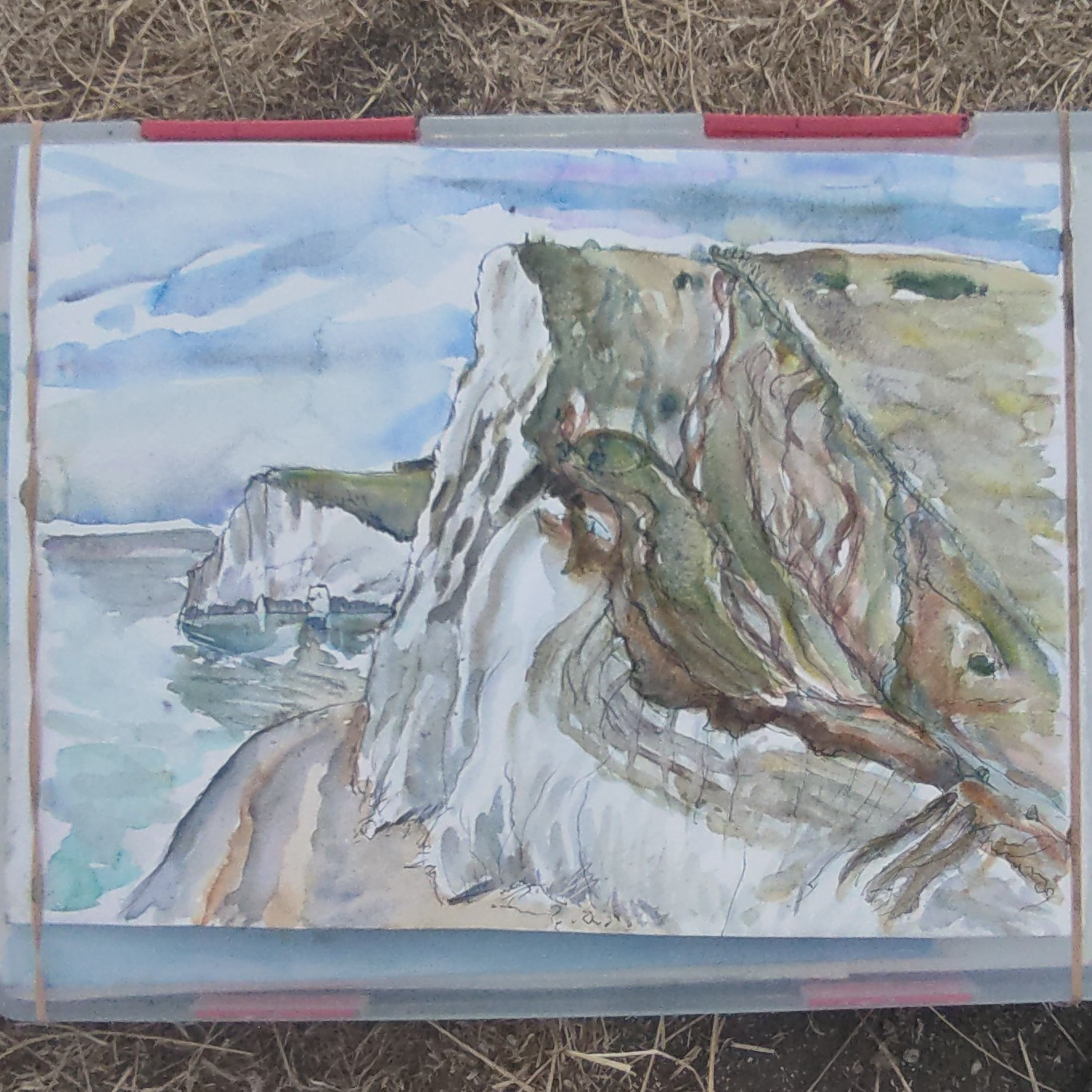 I got bored hanging around the campsite and head off to Preston and draw a thatched cottage then jump onto the bus to Durdle Door where I stayed last year... This time heading the other way facing the hills that defeated me from the other direction. Still too hot (indeed ambulance and coastguard are there waiting for the inevitable chaos) and feet are still too unhappy to tackle it so I painted two watercolours. One of that view which you can see in the episode arr, and a 30 minute timed piece of Durdle Door itself.