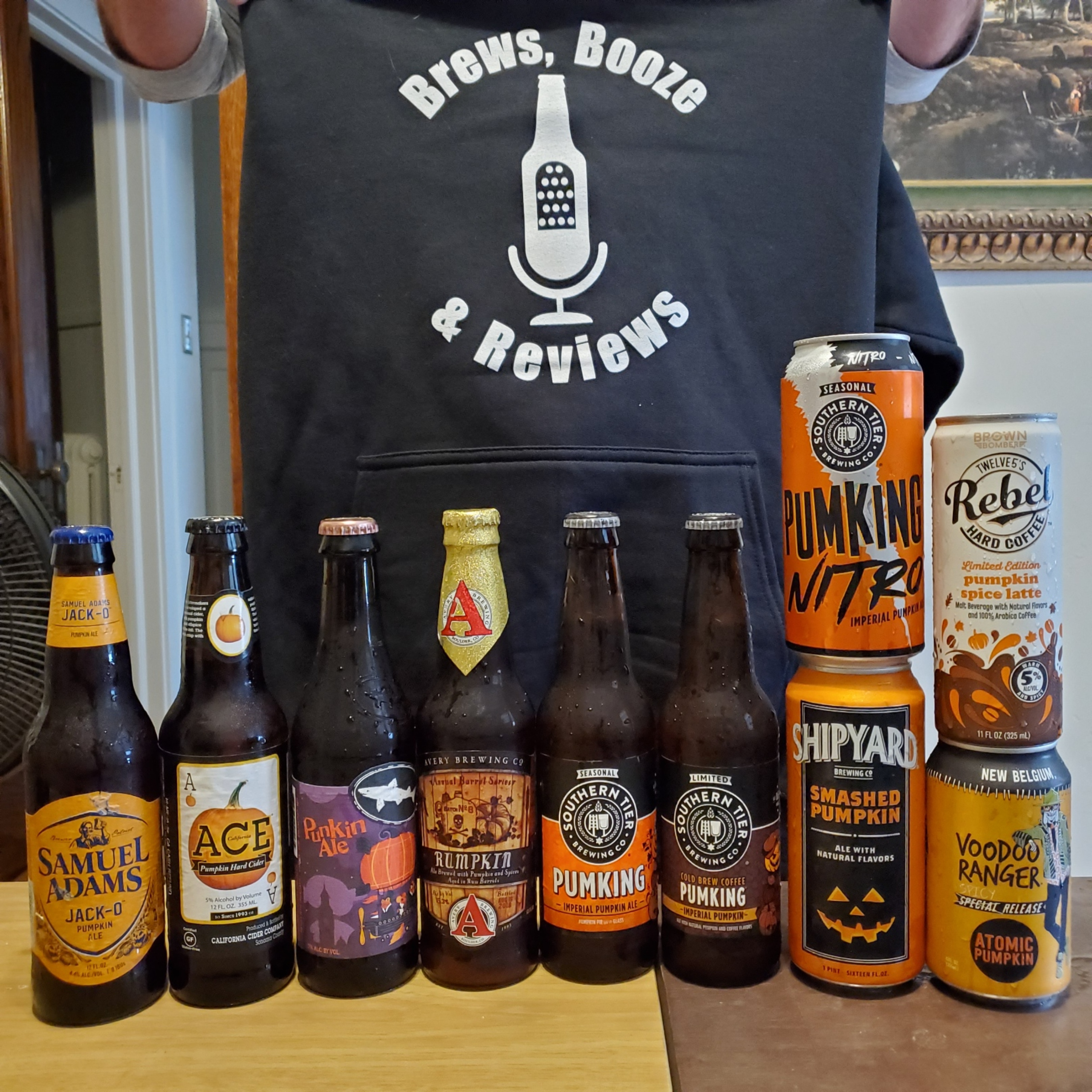 In this episode we sample and discuss Ace's Pumpkin Hard Cider, Samuel Adams' Jack-O, Dogfish Head's Punkin Ale, New Belgium's Voodoo Ranger Atomic Pumpkin, Avery Brewing's Rumpkin, three from Southern Tier Brewing including Pumking Imperial Pumpkin Ale, Pumking Nitro, and Cold Brew Coffee Pumking, Shipyard Brewing's Smashed Pumpkin, and Rebel Hard Coffee's Limited Edition Pumpkin Spice Latté. That's a frightening amount of brews to taste, but we're up to be the heroes (or zeroes) in this story and get it done!