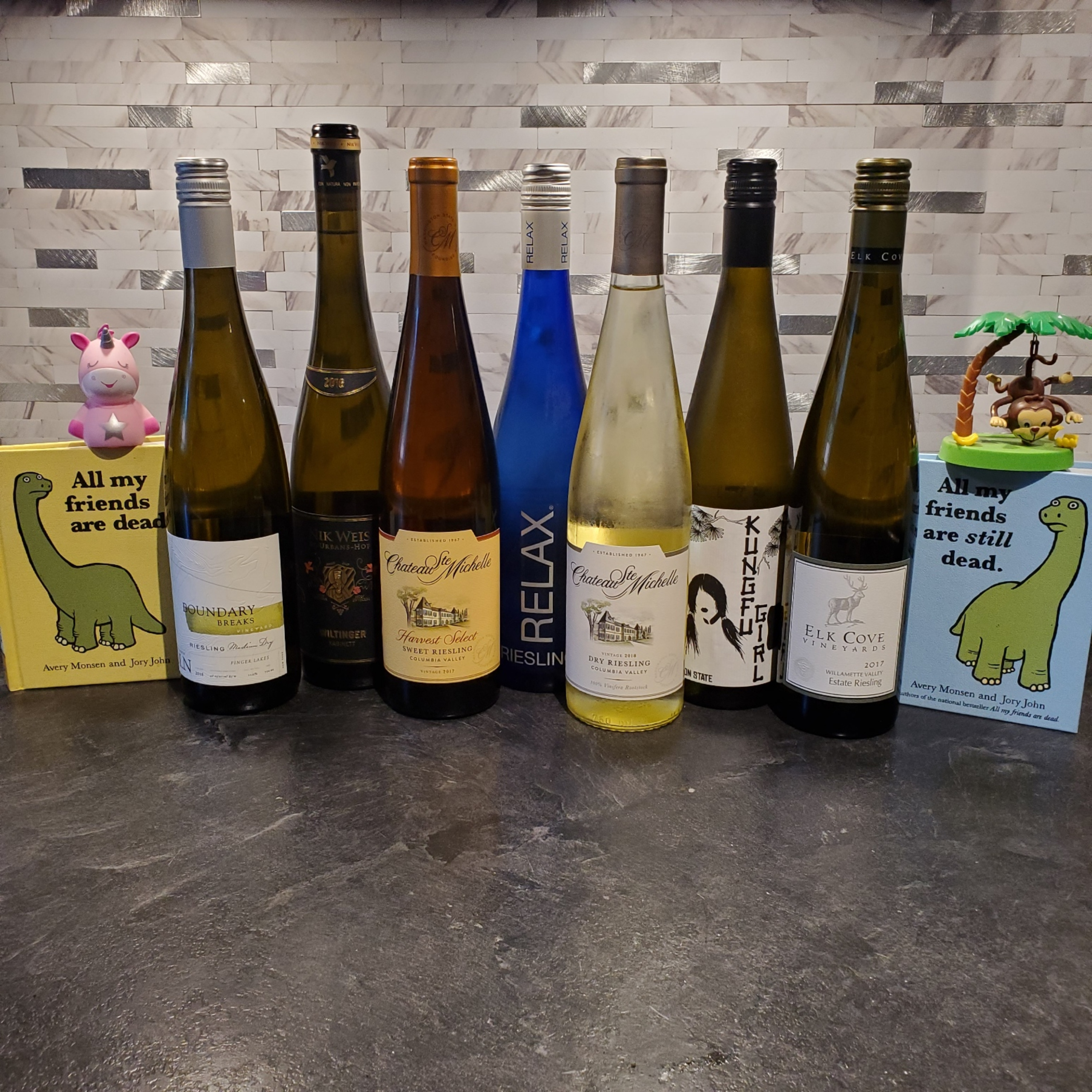 What's a better wine to enjoy in the hot summer months than a nicely chilled glass of white? And while Chardonnay is arguably the most popular of the white wines, today we delve into the sweet and/or dry world of Rieslings! We here at BBR most definitely were looking for an amusing adventure, so we collected our thoughts, set our eyes towards a gathering of grapes, and with a hearty twist of the bottle cap, we sample and review Boundary Break's 'OLN Ovid Line North' Medium Dry Riesling, Elk Cove's 2017 Willamette Valley Estate Riesling, the 2018 KungFu Girl from Charles Smith Wines, RELAX's RIesling, Nik Weis's St Urbans Hof Estate Riesling Old Vines, and two from Chateau Ste Michelle: their 2018 Columbia Valley Dry riesling, and their 2017 Harvest Select Sweet Riesling.