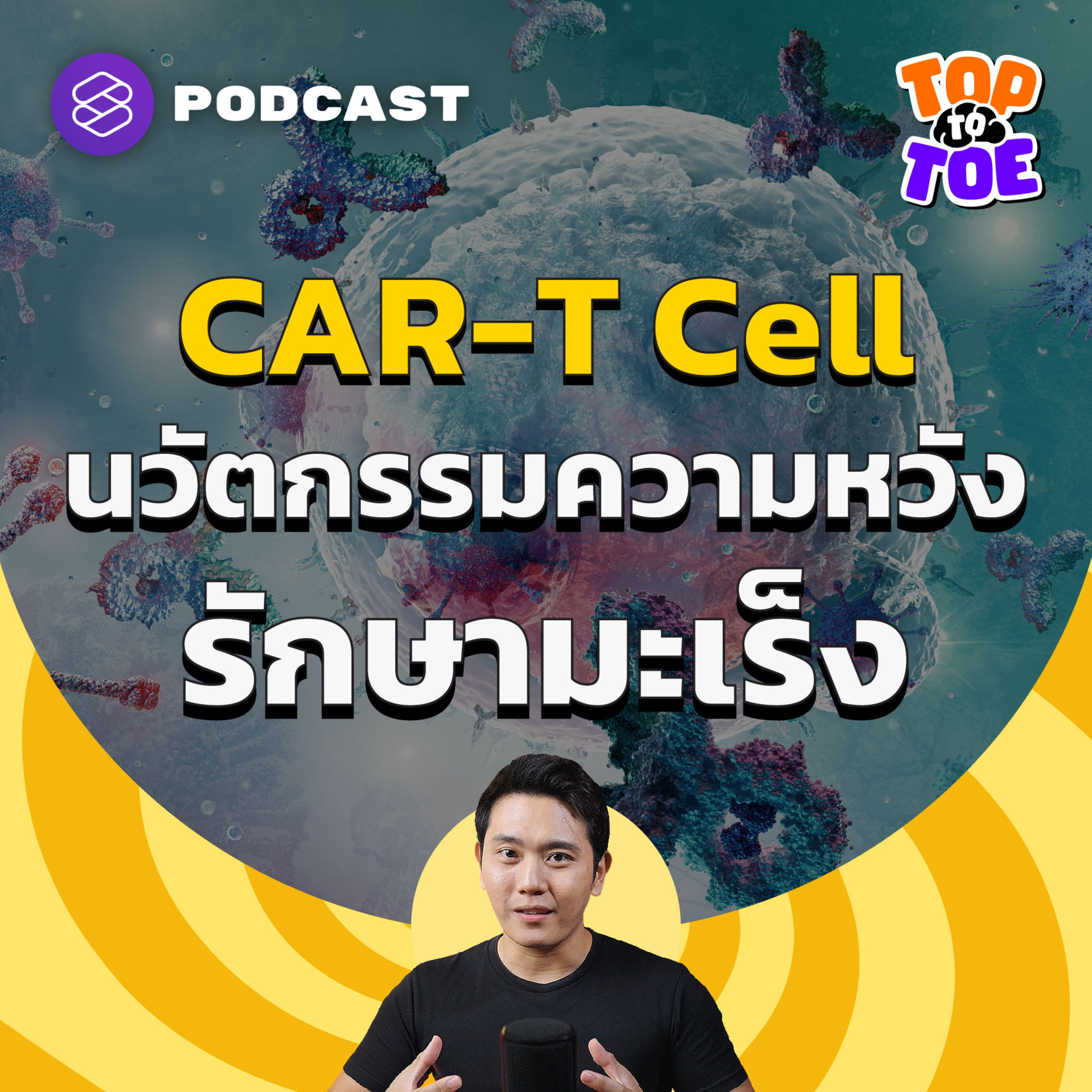 Top to Toe พอดแคสต์วิทยาศาสตร์สุขภาพพาไปทบทวนภูมิคุ้มกันของร่างกายแบบ B-Cell และ T-Cell ก่อนเจาะลึกลงไปในนวัตกรรม CAR T-Cell ว่ามีกระบวนการบำบัดกับผู้ป่วยอย่างไร ประสิทธิภาพมากแค่ไหน และถึงแม้ว่ายังเป็นนวัตกรรมที่ราคาสูง แต่เชื่อว่าวันหนึ่งมันจะเป็นสวัสดิการของประชาชนทั่วโลกในการรับมือโรคนี้