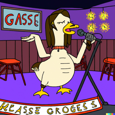 Thumbnail DALL·E prompt: "a goose doing standup comedy in front of a microphone in a dive bar, cartoon style"