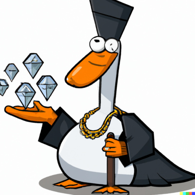 Thumbnail DALL·E prompt: "a goose dressed as a priest ogling a handful of diamonds, cartoon style"
