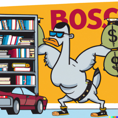 Thumbnail DALL·E prompt: "a muscle-bound goose standing in front of a bookshelf full of books and a very expensive car holding a wad of cash, cartoon style"