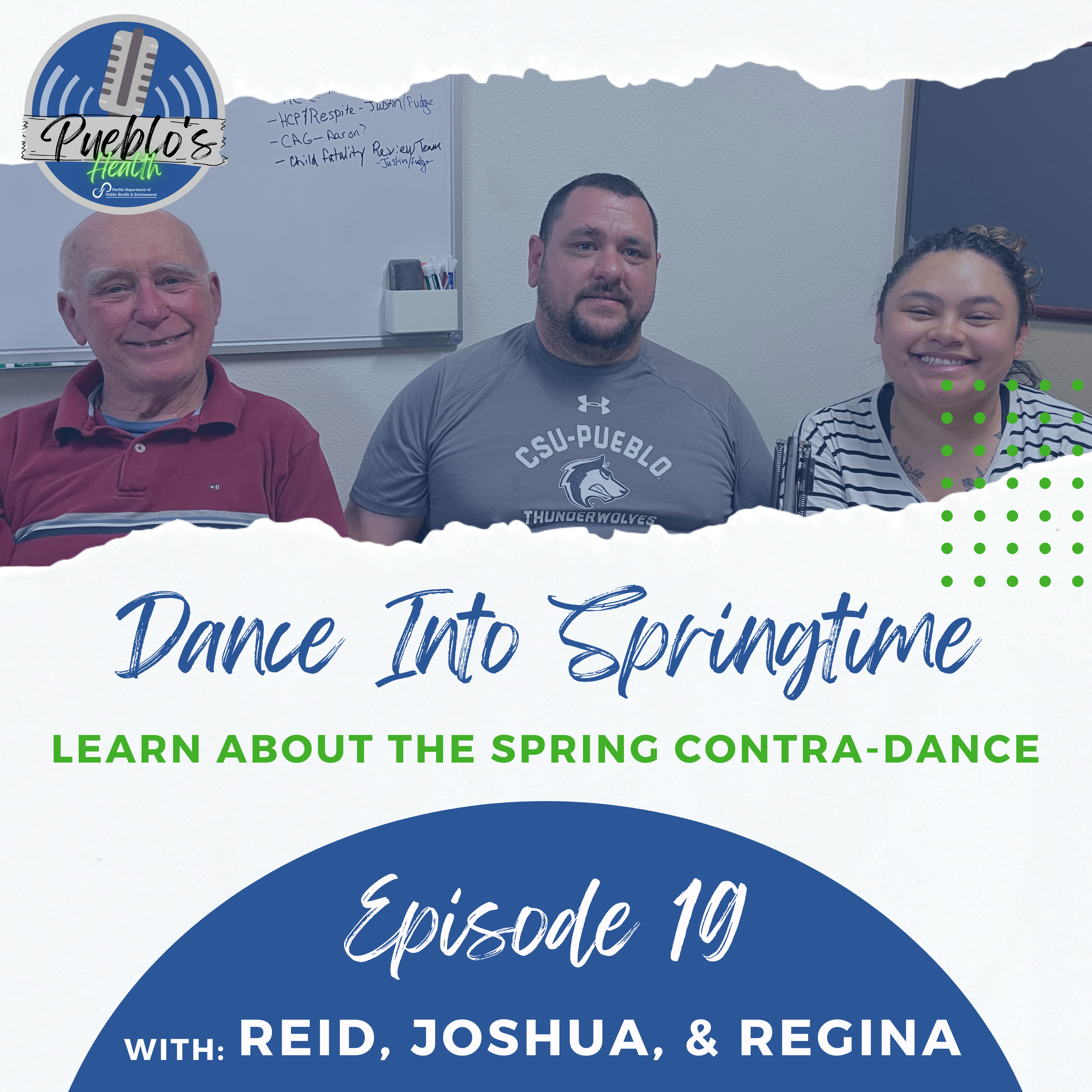 Reid Miller, an educator and dance leader, re-joins the podcast to discuss an upcoming event on the campus of CSU-Pueblo. The Spring Contra-Dance returns this year and is a great way for people in the community to get active, learn about dancing, and meet their community. Joshua and Regina, who are students in the class, have worked to bring the event back to campus and share about their favorite lessons in this special edition of Pueblo's Health!