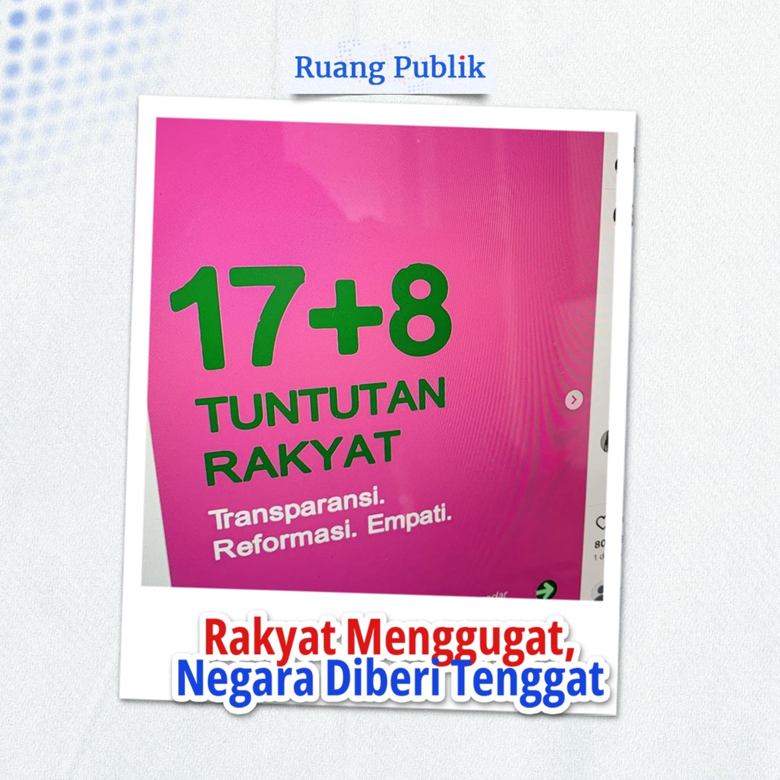 Gelombang protes publik berkumandang di dunia maya lewat unggahan "17+8 Tuntutan Rakyat" sejak Sabtu (30/08). Unggahan yang memuat total 25 tuntutan ditujukan kepada Presiden, DPR, partai politik, Polri, dan TNI. Isinya, antara lain mendesak pembebasan seluruh demonstran yang ditahan, pembekuan tunjangan DPR, hingga penarikan TNI dalam pengamanan sipil.
