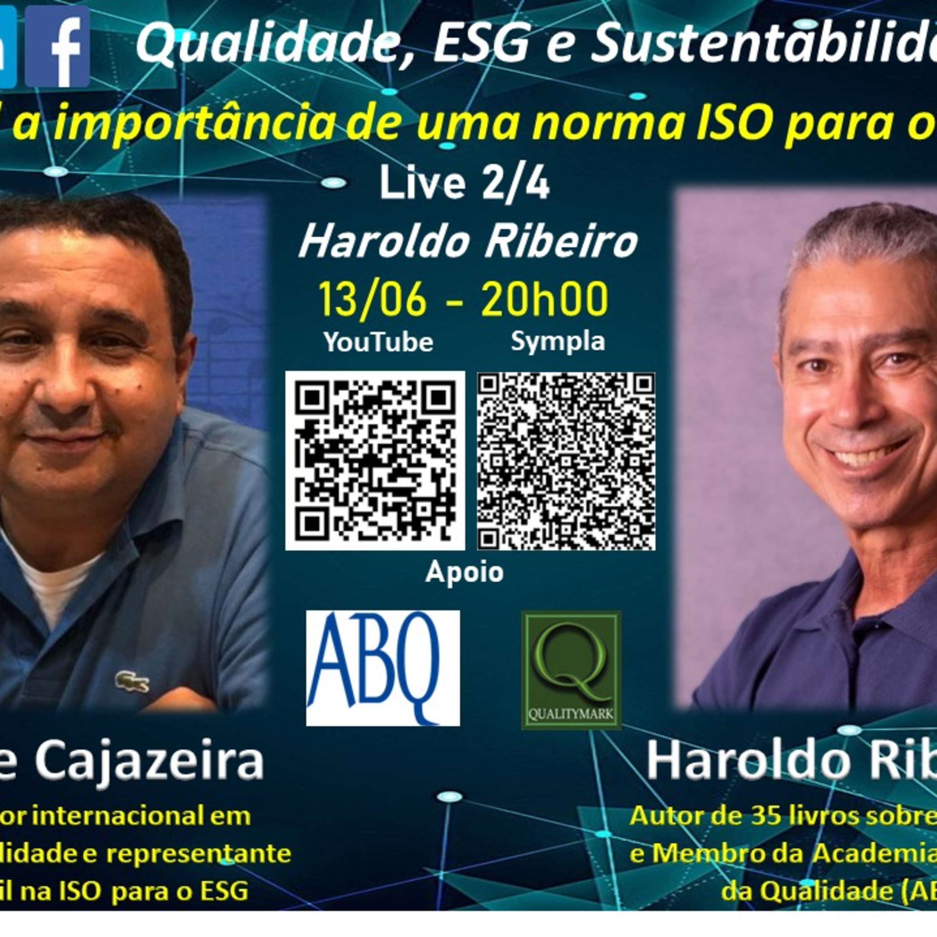 Este é o áudio da Live do dia 13/06/2022, com o meu colega da Academia Brasileira da Qualidade, Jorge Cajazeira, para comentar sobre a importância de uma norma ISO para o ESG. Cajazeira representa o Brasil, com mais Inglaterra e Canadá, na discussão de uma norma ISO para o ESG. Ele liderou a primeira certificação ambiental no Brasil e uma das três primeiras no mundo. Foi Juiz do Prêmio Nacional da Qualidade em vários ciclos. Coordenou o projeto de conquista do PNQ em 2001 e 2009 da Suzano Papel e Celulose e Bahia Sul Celulose. Foi Diretor de Relações Institucionais e Certificações da Suzano Papel e Celulose. Ex-Presidente Mundial para a ISO 38200. Foi o primeiro brasileiro a presidir um comitê mundial da ISO (a Norma ISO 26000).