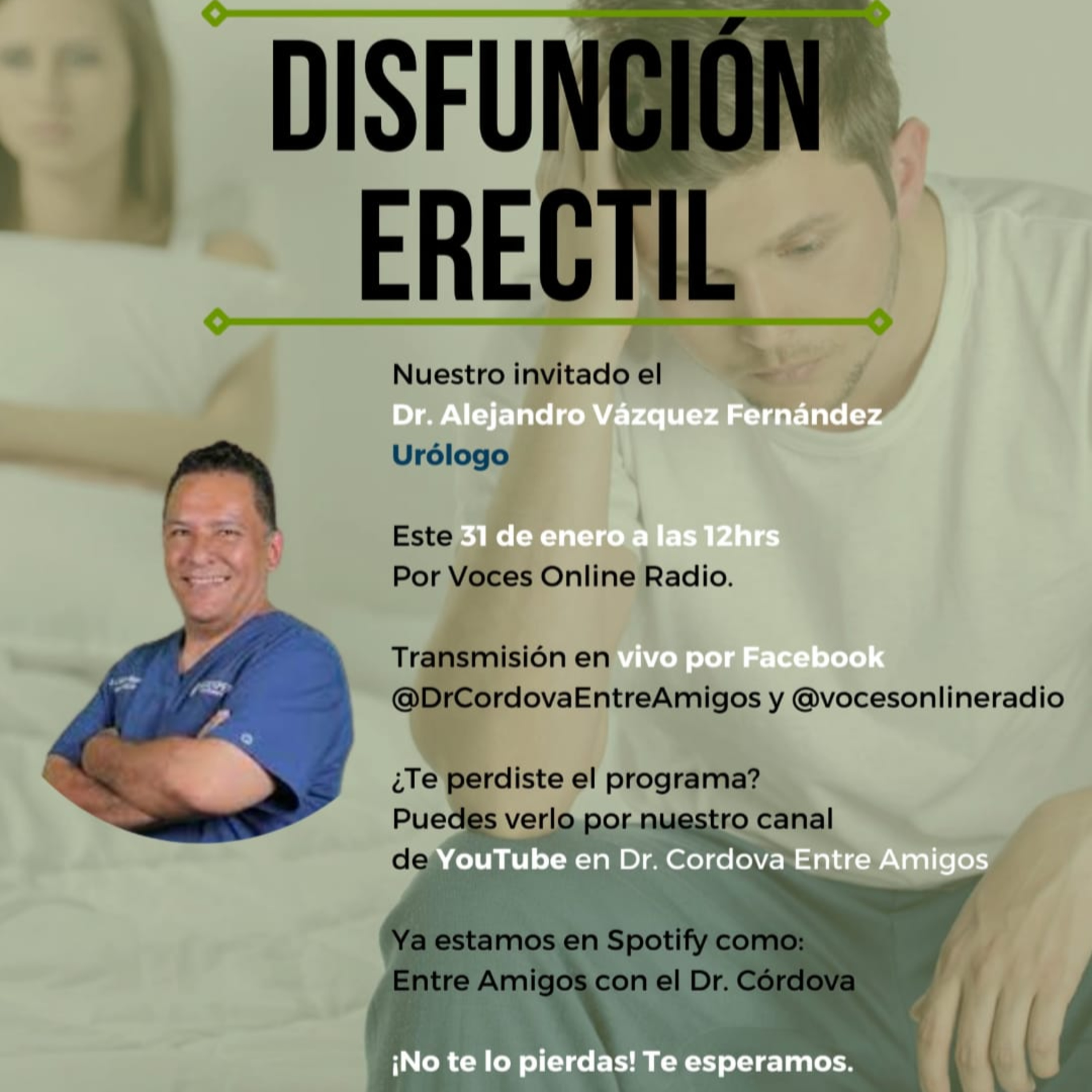 Hoy nos acompaña el Dr. Alejandro Vázquez Fernández, Urólogo, para hablarnos sobre la Disfunción Erectil.