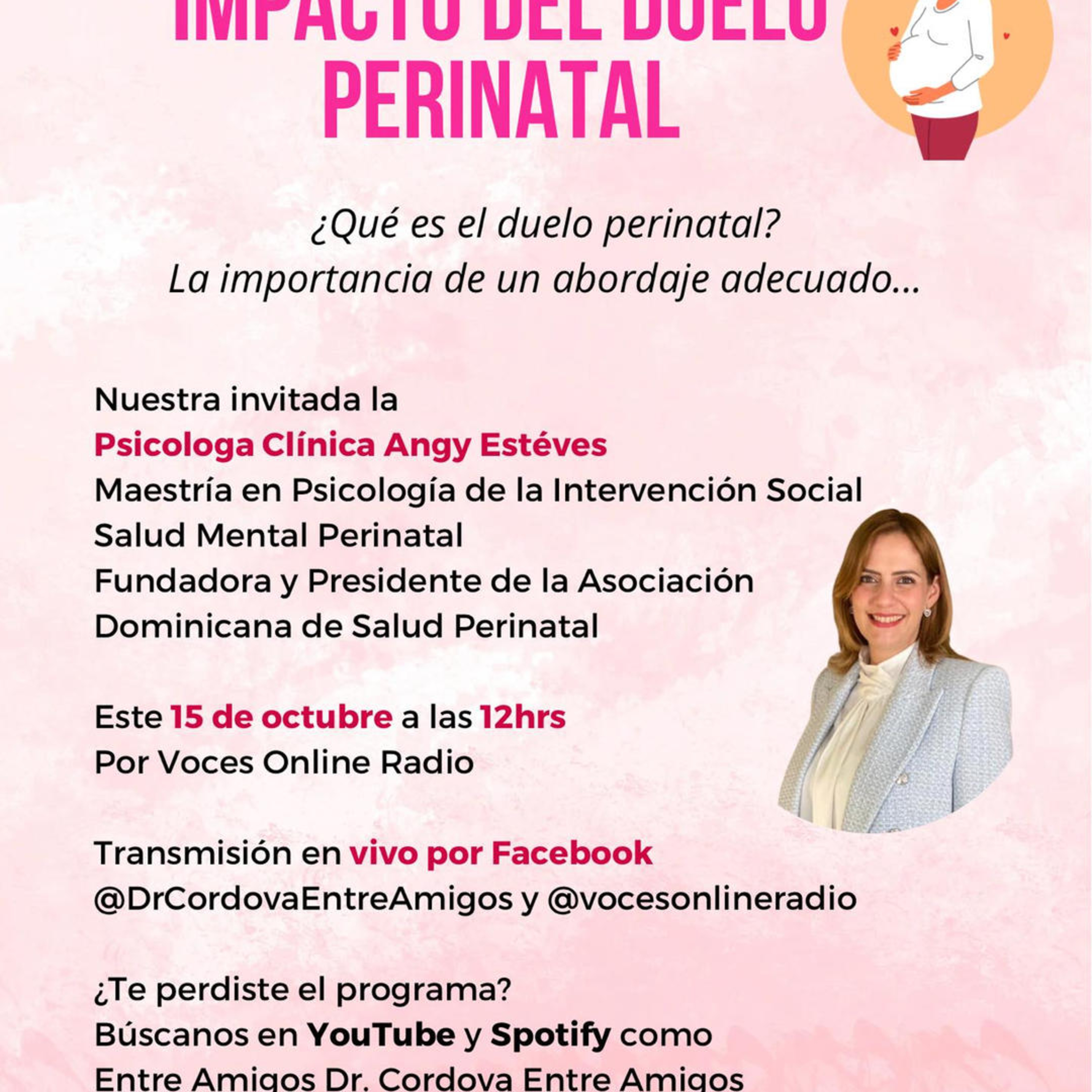Hoy nos acompaña desde República Dominicana vía Zoom la Psicóloga Clínica Angy Estéves, Maestría en Psicología de la Intervención Social, Salud Mental Perinatal, Fundadora y Presidente de la Asociación Dominicana de Salud Perinatal, para hablarnos sobre el tema: "Impacto del Duelo Perinatal"