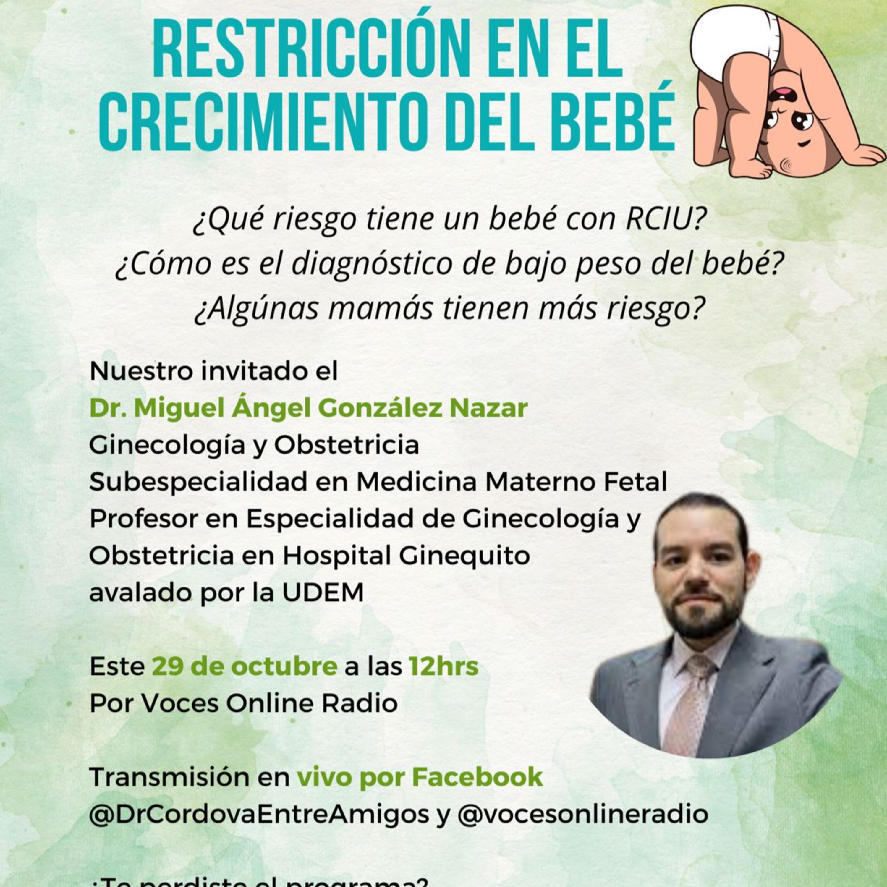 Hoy nos acompaña el Dr. Miguel Ángel González Nazar, Ginecología y Obstetricia, Subespecialidad en Medicina Materno Fetal, Profesor en Especialidad de Ginecología y Obstetricia en Hospital Ginequito avalado por la UDEM, para hablarnos sobre el tema: "Restricción en el Crecimiento del Bebé".