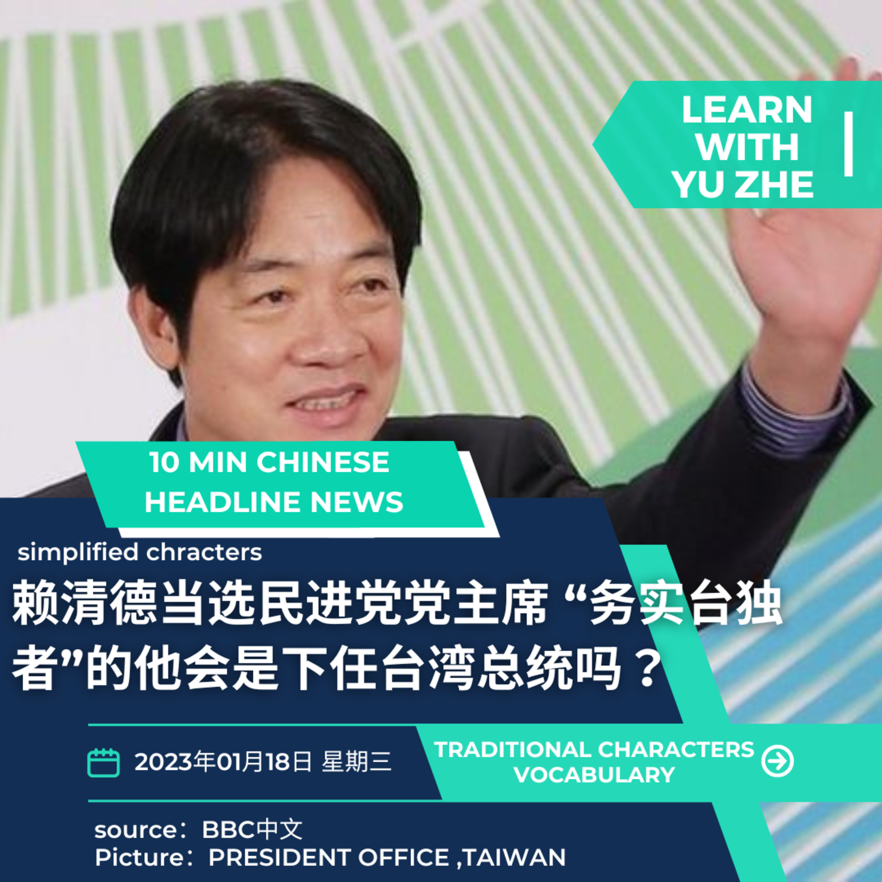 🇹🇼今天就要来看看台湾最近的新闻,上星期都没介绍,有点可惜。民进党选出了党主席,他是谁?他未来会怎么做?我们来一起看新闻、学中文。
