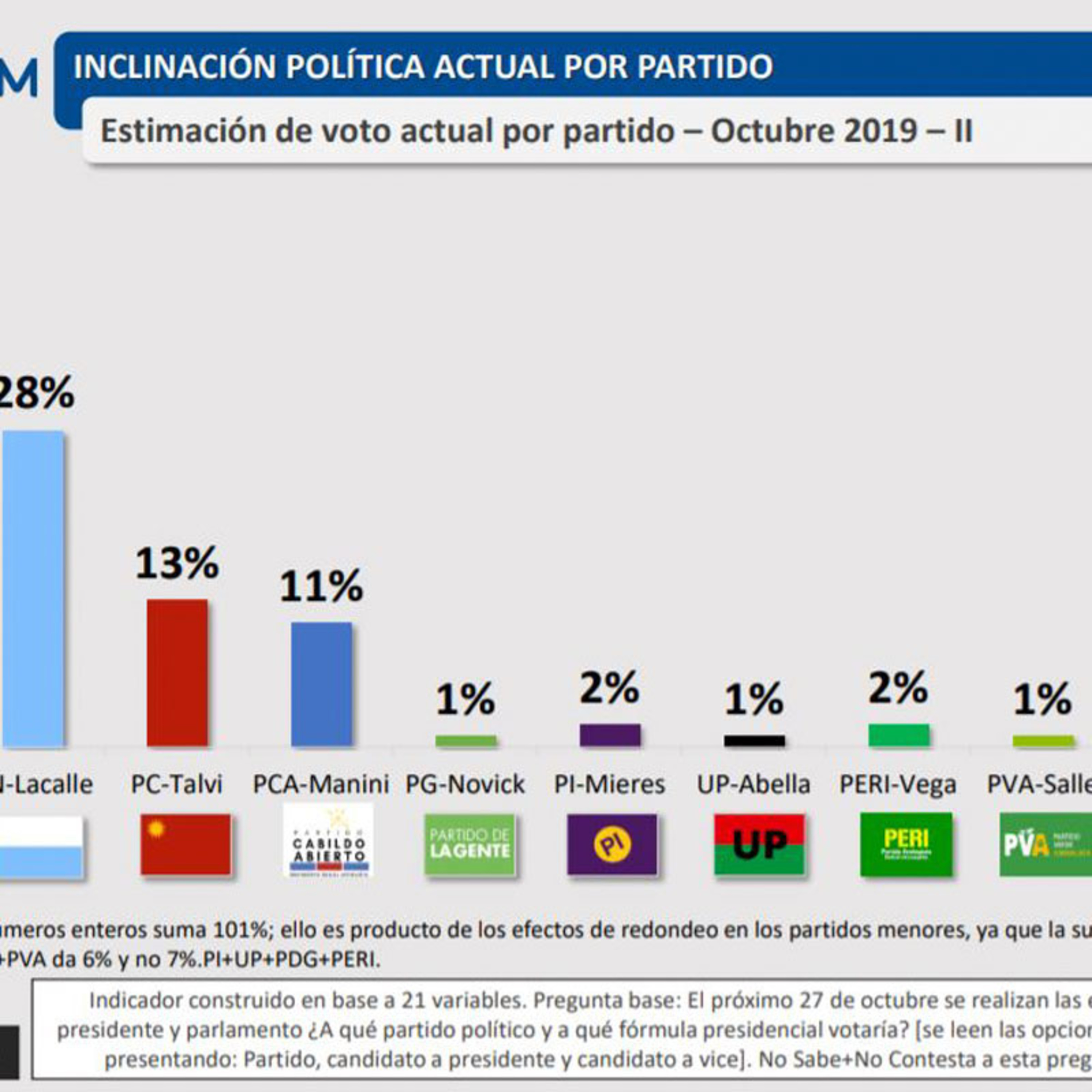 Intención de voto según Factum: FA 40%, PN 28%, PC 13 y CA 11%. El 47% cree que el presidente será Martínez y el 43% que será Lacalle Pou.