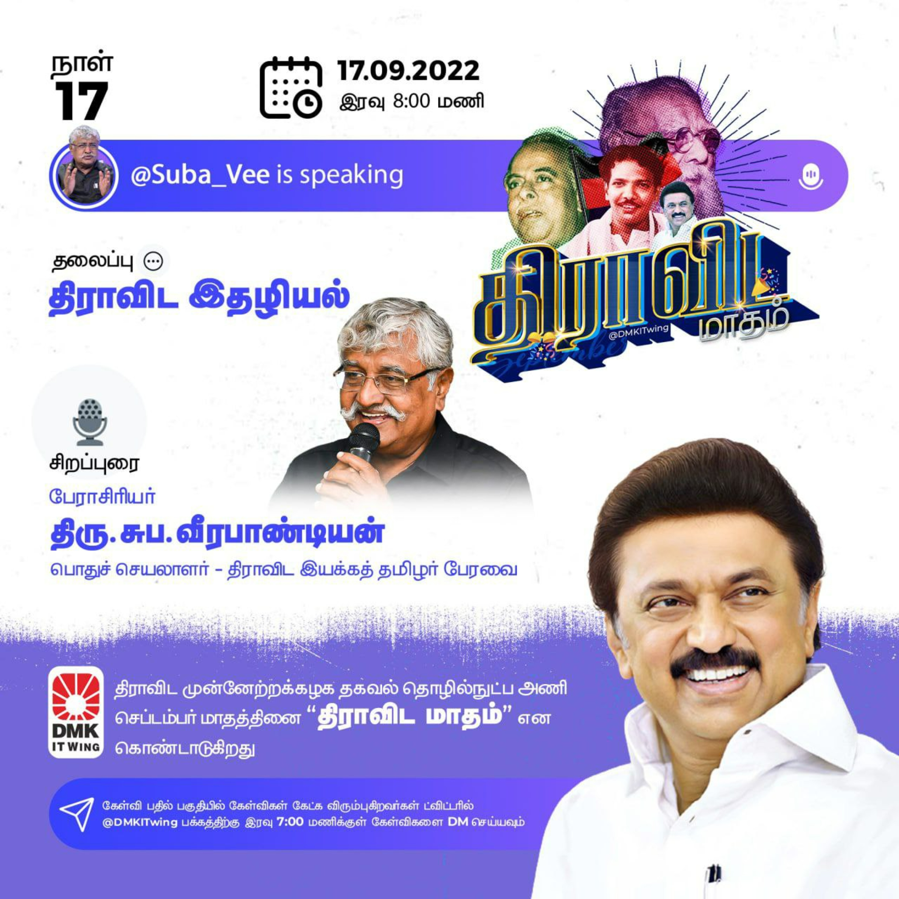 @TwitterSpaces நிகழ்ச்சியில் 'திராவிட இதழியல்' எனும் தலைப்பில் சிறப்புரையாற்றுகிறார் திராவிட இயக்கத் தமிழர் பேரவையின் பொதுச்செயலாளர் பேரா@Suba_Vee அவர்கள்.