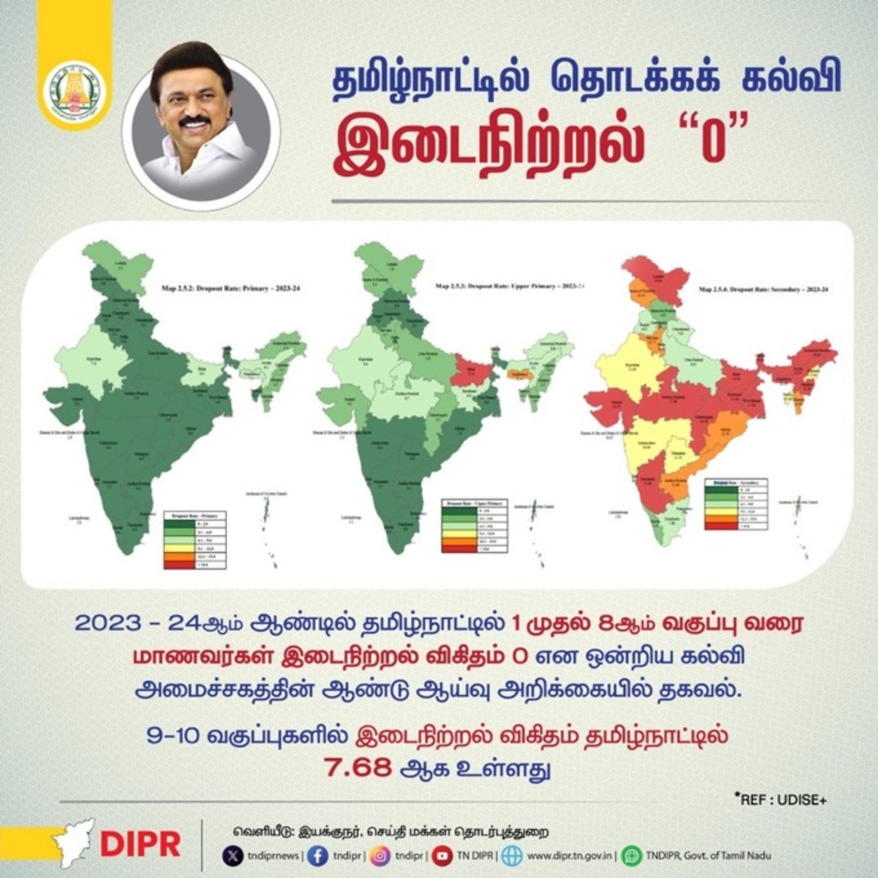 தமிழ் நாட்டில் தொடக்க கல்வி இடை நிற்றல் 0. ஸ்டூடண்ட் பள்ளிக்கு வரவில்லை என்றால் சமூக, பொருளாதார, உளவியல் என்ற அனைத்து வகைகளில் ஆய்வு செய்து திட்டமிடப்பட்ட கல்வி துறை, ஆசியர்கள் அதிகாரிகள் அரசு என அனைவரின் முழு முயற்சியும் இல்லாமல் இது சாத்தியமில்லை. எவ்வளவு பாராட்டினாலும் தகும்.
