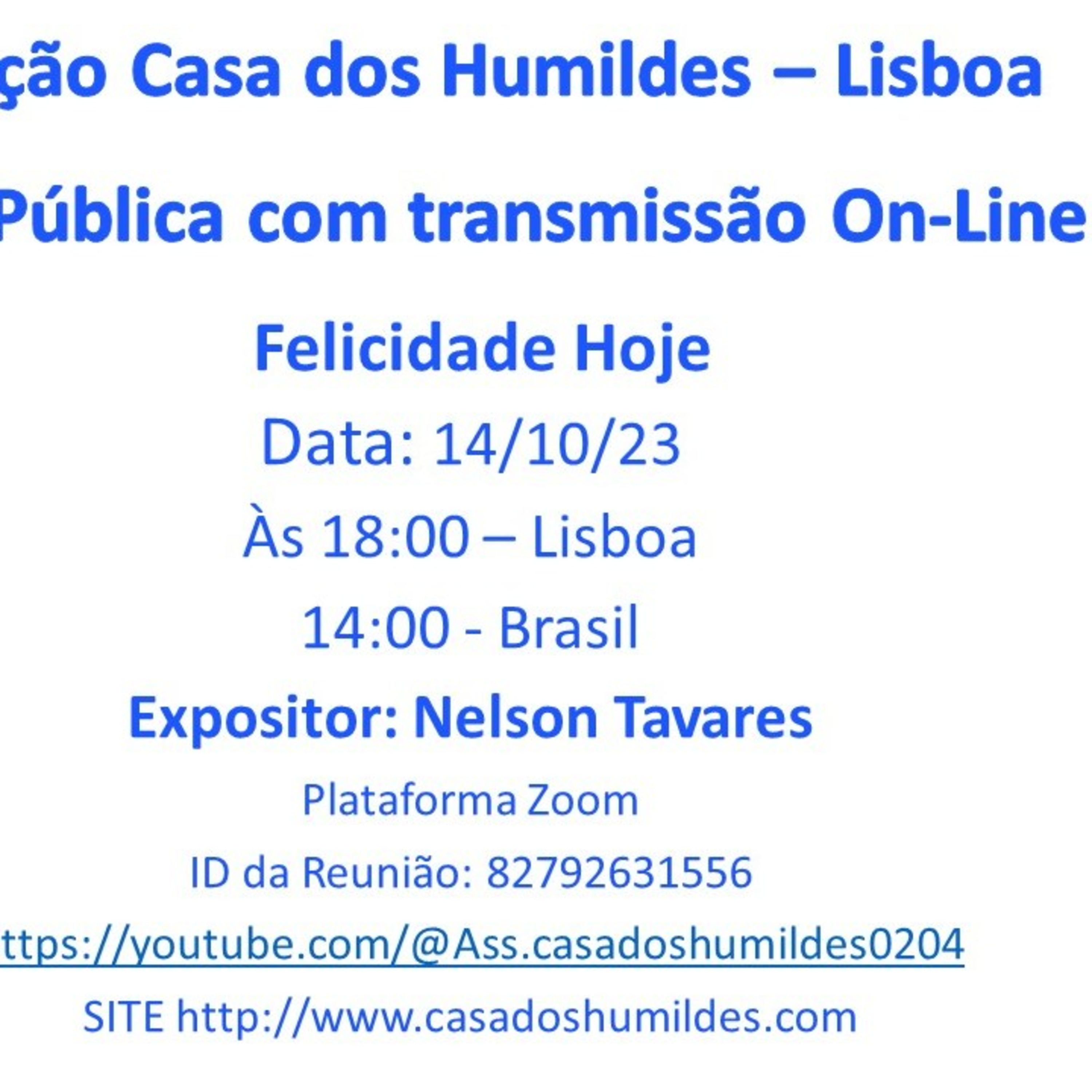 Palestra realizada na Associação Casa dos Humildes - Lisboa - Portugal no dia 14/10/2023