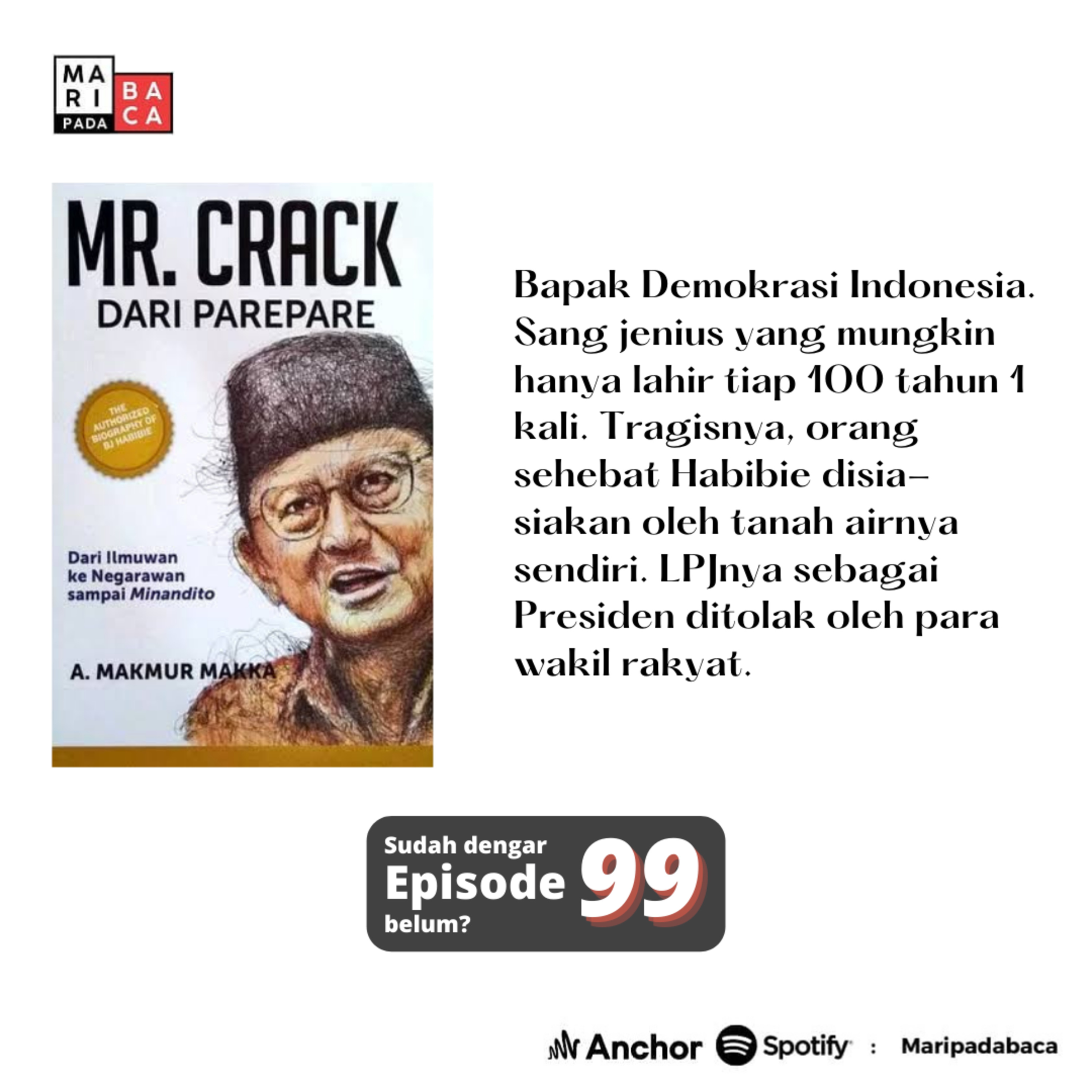 Bapak Demokrasi Indonesia. Sang jenius yang mungkin hanya lahir tiap 100 tahun 1 kali. Tragisnya, orang sehebat Habibie disia-siakan oleh tanah airnya sendiri. LPJnya sebagai Presiden ditolak oleh para wakil rakyat.