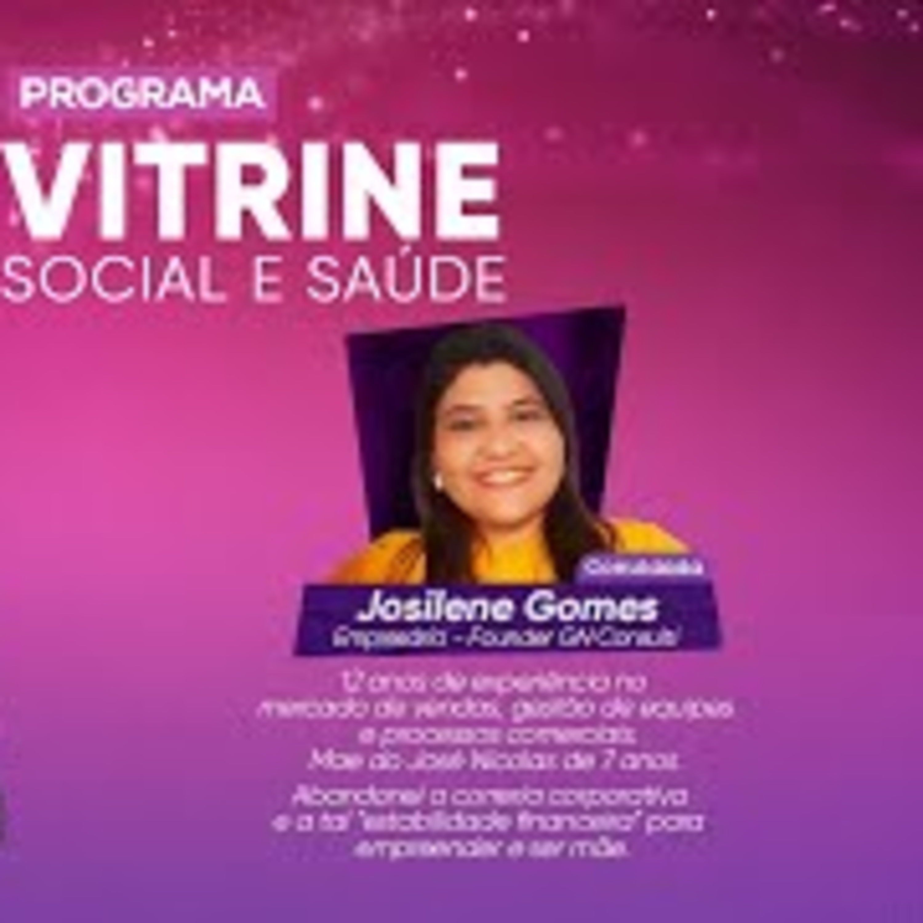 Convidados: Josilene Gomes, Empresária, Founder GN Consulti ,12 anos de experiência no mercado de vendas, gestão de equipes e processos comerciais. Mãe do José Nicolas de 7 anos.