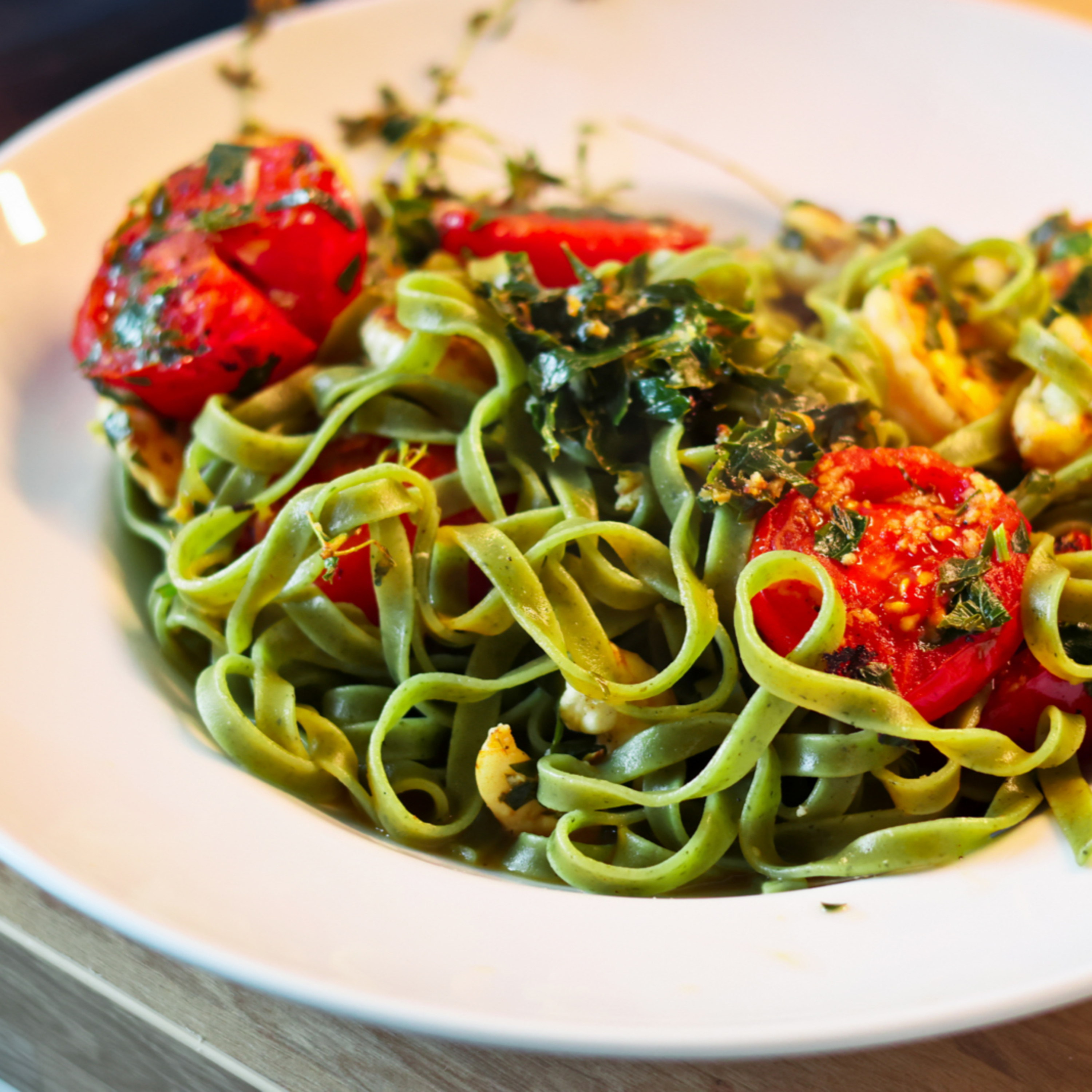Endlich ist der Sommer da! Da möchte man am liebsten die ganz Zeit draußen sein. Wenn man dann doch mal etwas kochen möchte, dann auch was schnelles, leichtes und sommerliches. Wie wäre es mit angebratenen Garnelen mit geschmorrten Tomaten auf einem Pasta Nest mit frischer Zitronensoße? Hört sich lecker an? Dann ab an den Herd und nachgekocht!