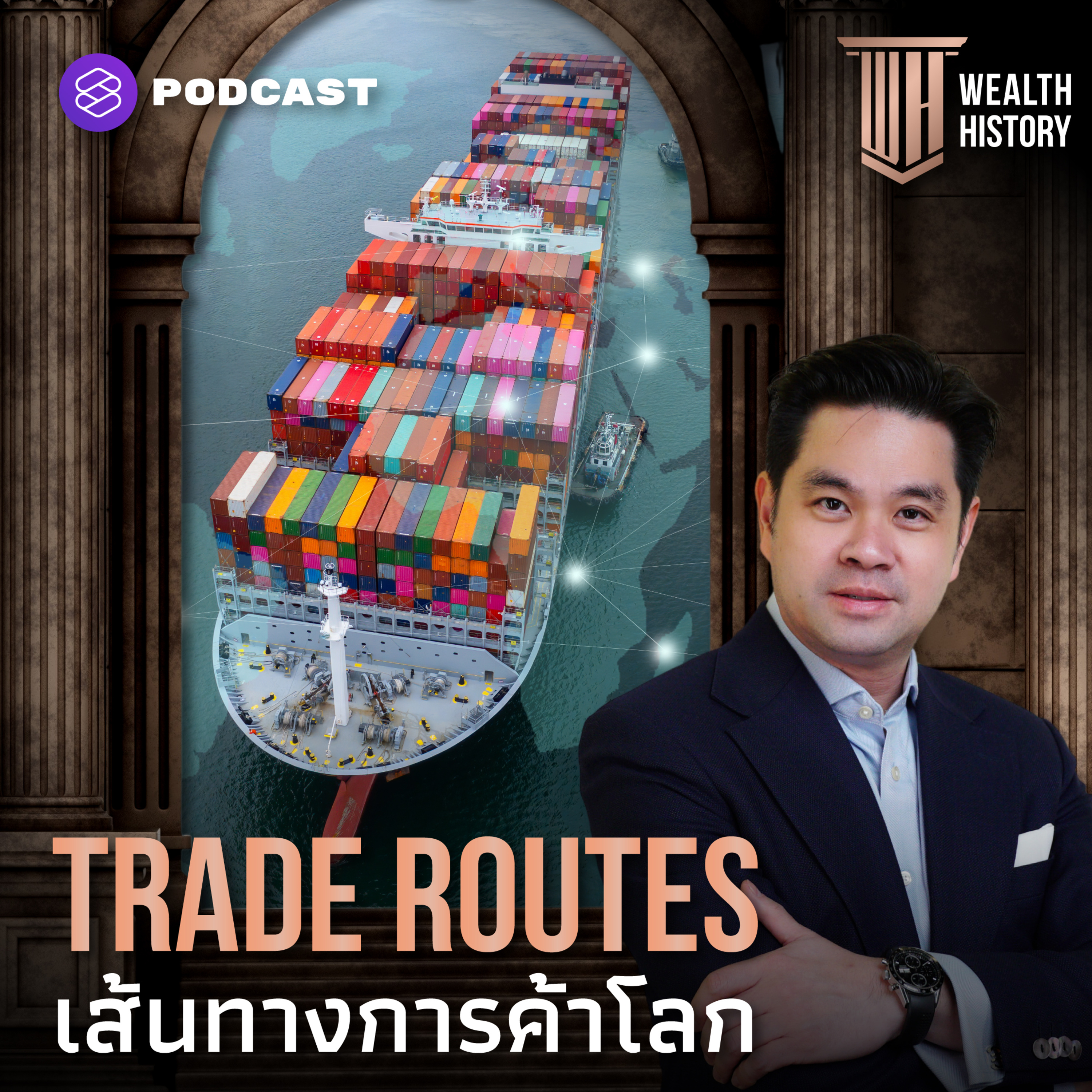 Wealth History EP.35 นี้ ชวนพูดคุยถึงวิวัฒนาการของเส้นทางการเดินเรือ Trade Routes สำคัญของโลก เพื่อมอง ‘การค้าโลก’ ให้เห็นภาพมากขึ้น เพราะไม่ว่าโลกเราจะเป็น Globalized, Fragmented หรือว่า Decoupling ก็ต้องใช้เส้นทางเหล่านี้ในการเดินทางค้าขายระหว่างกันอยู่ดี