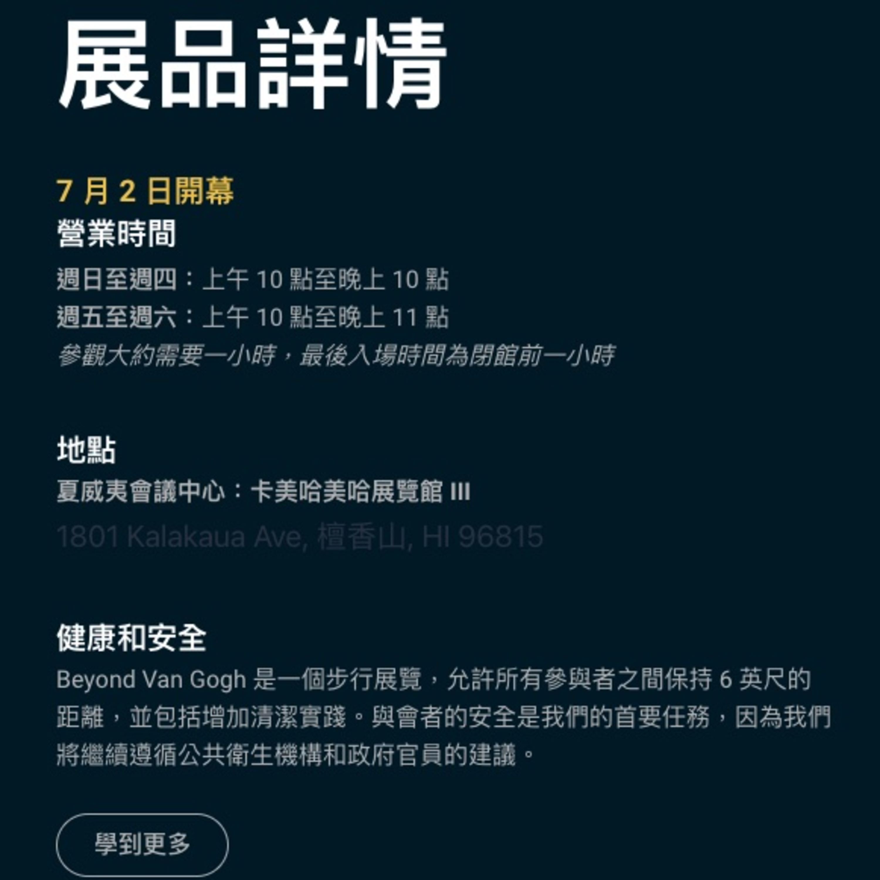 》梵谷畫展(Beyond Van Gogh Honolulu)已在夏威夷會展中心公開展出,展出至8月15日止。可以網上購票:https://vangoghhonolulu.com/