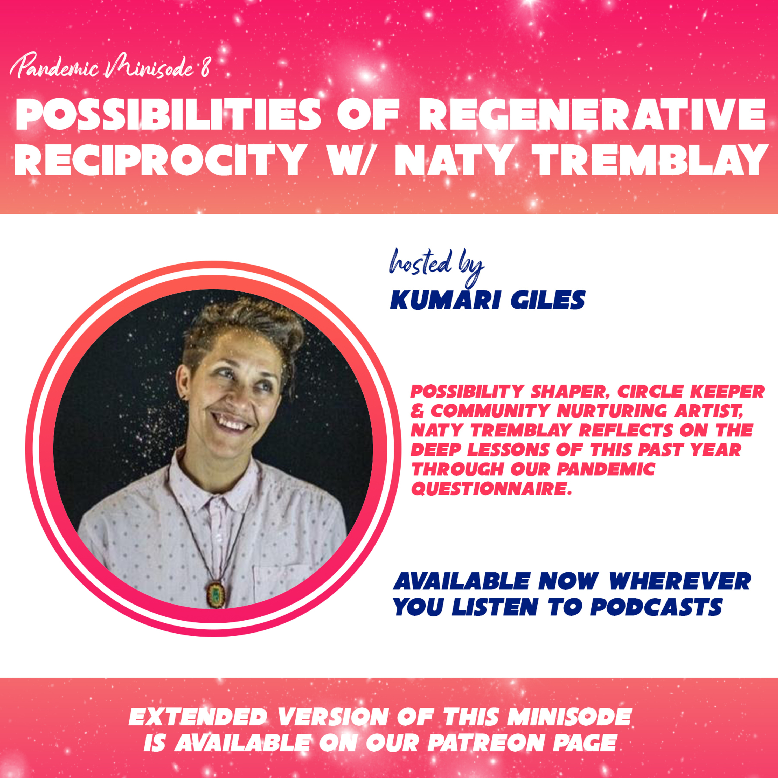 ID: White block text on pink background reads "POSSIBILITIES OF REGENERATIVE RECIPROCITY W/NATY TREMBLAY ”. Below, there’s a circular photo of Naty, a metis francophone person smiling head tilted with short hair, shaved on the sides. They are wearing a soft pink shirt and necklace and there’s glitter surrounding them. Blue and pink alternating, text reads: “hosted by KUMARI GILES” "POSSIBILITY SHAPER, CIRCLE KEEPER & COMMUNITY NURTURING ARTIST NATY TREMBLAY REFLECTS ON THE DEEP LESSONS OF THIS PAST YEAR THROUGH OUR PANDEMIC QUESTIONNAIRE" "AVAILABLE NOW WHEREVER YOU LISTEN TO PODCASTS" At the bottom, white block text on pink background reads “EXTENDED VERSIONS OF MINISODES IS AVAILABLE ON OUR PATREON PAGE”.