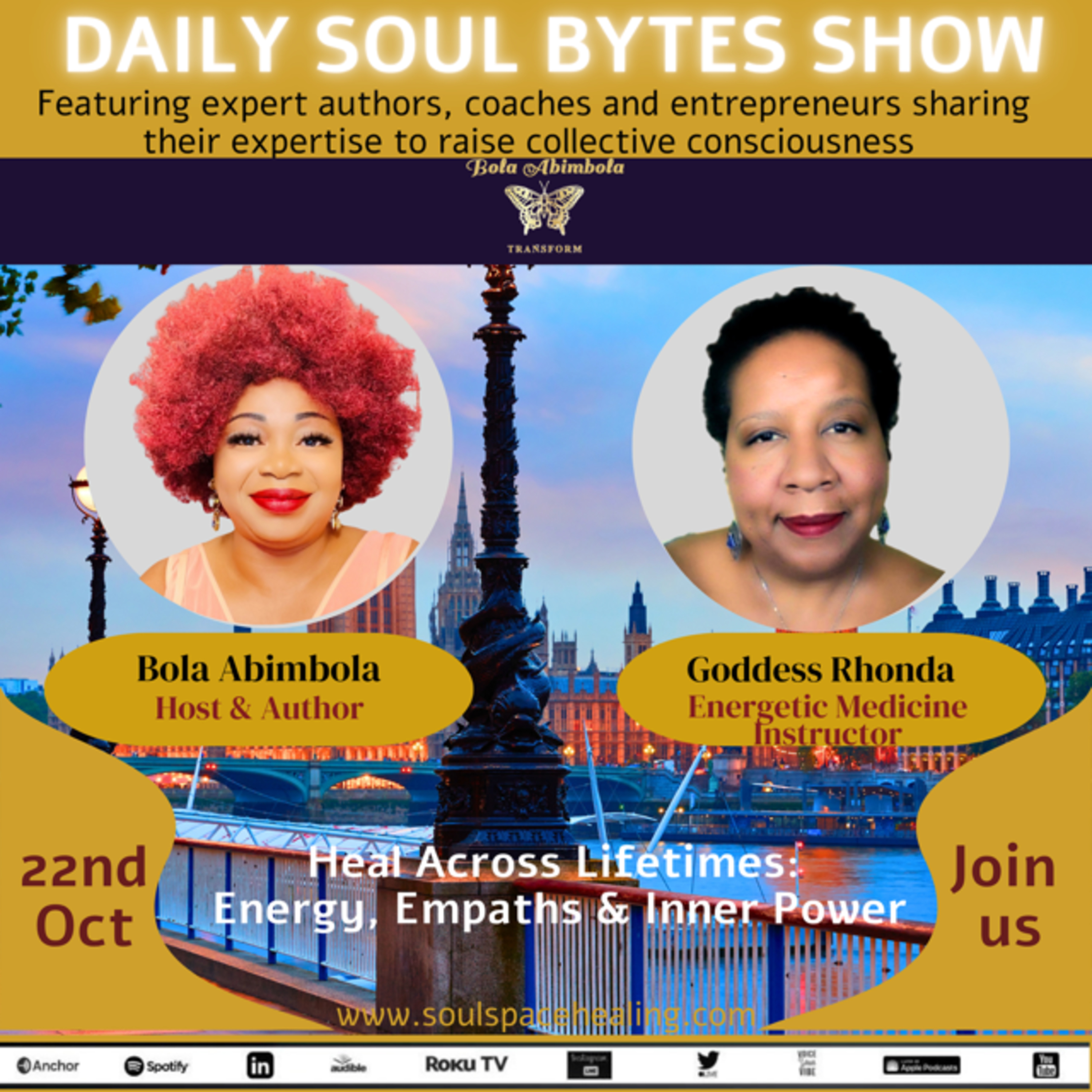 🚨 Daily Soul Bytes Show: A sacred pause. A portal inward 🚨 🌎🎙 Our Honoured Featured Speaker 🌎🎙 Rhonda Harris Choudhry Author, Energetic Medicine Instructor, Resolution Psychic After losing her husband, surviving a 20-pound tumour, and the collapse of her career, Divine Guidance and early healing training led Rhonda to her true calling. Rhonda now empowers empaths, healers, and spiritual seekers to unlock their potential, clear energetic blocks, and step into their divine power. Season 4, Episode 24 Heal Across Lifetimes: Energy, Empaths & Inner Power ✅ Main Soul Teachings:⭐️ Every healing begins with remembering: you are not broken, you are becoming whole.⭐️ Our energy fields hold stories from this life and beyond, when we listen, we unlock transformation.⭐️ Past life trauma can show up as present pain, healing requires compassion, not judgment.⭐️ Empaths are powerful when they set boundaries and honour their energy, they stop absorbing and start awakening.⭐️ The path to purpose often begins where everything falls apart, loss, illness, and uncertainty can be sacred thresholds.✅ Soul Prompt:What energetic weight, yours or ancestral, are you still carrying, and what would it mean to lay it down today? ✅ Soul Byte: You are not here to fix yourself.You are here to remember your light, release old pain, and rise into the healer, guide, and soul you were always meant to be. ~~~~~~~~~~~~~~~~~~~~~~~~~~New exciting news on Daily Soul Bytes Show: Are you looking for high quality, high frequency gemstones?: Get your triple grade A Otter Spirit gemstones : https://otterspirit.com/?ref=bolaabimbola-official👉 Use special couple codes :• BOLA20 → 20% off any order• BOLA30 → 30% off orders over $99 🎉~~~~~~~~~~~~~~~~~~~~~~~~~~~🎧Listen on Apple 🎙️ 🎦Watch on You Tube from 0.01am BST Weds 22nd Oct/ 7pm Eastern Tues 21st Oct Want to see more great content like this? Here's what you can do to support her channel:▬▬▬▬▬▬▬▬▬▬▬▬▬▬▬▬▬▬▬▬▬▬▬▬▬▬▬👍Give the video a like💬Leave a comment with your thoughts🔗Share the video with anyone you think would benefit from it.▬▬▬▬▬▬▬▬▬▬▬▬▬▬▬▬▬▬▬▬▬▬▬▬▬▬▬📱 Bola Abimbola’s links ⁍ Website: https://www.soulspacehealing.com/quantum-reiki⁍ Caregiver Professional Certification Program: www.theccrp.com⁍ Facebook: https://www.facebook.com/bola.abimbola.18/⁍ You Tube: https://youtube.com/@bolaabimbola-official?feature=shared ⁍ Instagram: https://www.instagram.com/soulspace_healing/⁍ Apple Podcast: https://podcasts.apple.com/gb/podcast/daily-soul-bytes-show/id1725682894⁍ Spotify: https://tinyurl.com/yp2vub6n ~~~~~~~~~~~~~~~~~~~~~~The Daily Soul Bytes Show with 'Bola Abimbola 🎙️ 🌎 Goddess Rhonda’s links:🌍 ⁍ You Tube: http://www.youtube.com/user/Azjua7/featured⁍ Facebook: https://www.facebook.com/GoddessRhonda/⁍ Instagram: https://www.instagram.com/goddessrhonda/channel/?hl=en⁍ LinkedIn: https://www.linkedin.com/in/goddessrhonda/⁍ Meet Up: http://www.meetup.com/GoddessSpiritualityCircle/https://www.meetup.com/land-of-enchantment-healing-artists/~~~~~~~~~~~~~~~~~~~~~~~~~~~~Thank you for your support and co-creation 🚀🚀~~~~~~~~~~~~~~~~~~~~~~~~~~~~ #bolaabimbolaauthor #goddessrhonda #RhondaHarrisChoudhry#dailysoulbytes #multidimensional #dailysoulbites #leadership#dailysoulbytesshow #bolaabimbola #selfawareness Disclaimer:The views and opinions expressed by the guests on this show are their own and do not necessarily reflect those of Daily Soul Bytes Show or Bola Abimbola. Our platform serves as a space for open exploration and dialogue on spiritual and personal growth topics. Copyright Notice: This show and our YouTube channel contain copyrighted music and images. Unauthorized re-uploads, publications or any other use of our content is strictly prohibited. Any public, media, and any other business usage are subject to a business license. © Bola Abimbola Official