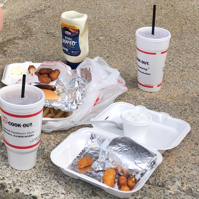 Kenny and Eva celebrate their anniversary at Cook Out, a regional fast food chain. They stuff their faces with cheese curds and hush puppies on the side of the road.