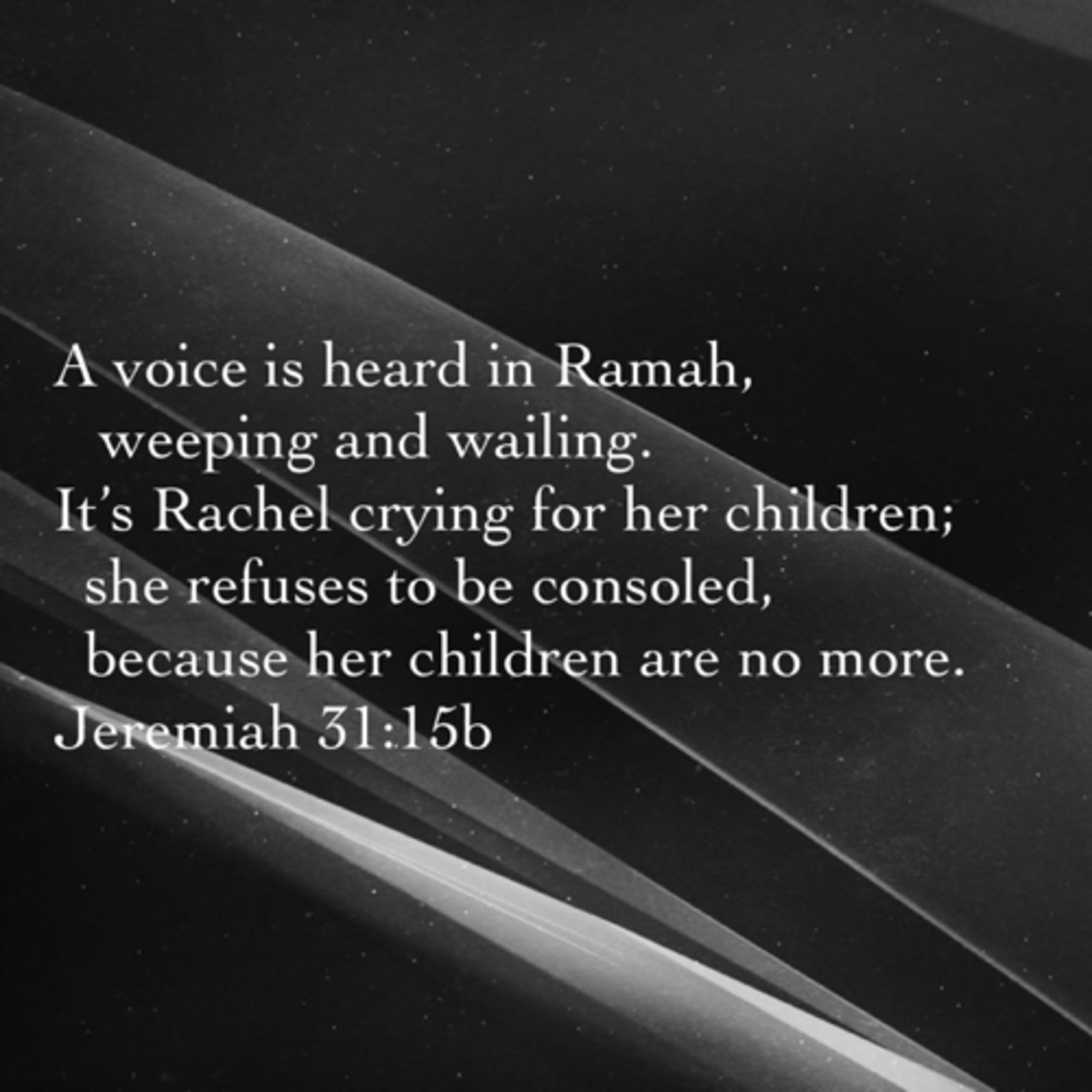 A voice is heard in Ramah, weeping and wailing. It’s Rachel crying for her children; she refuses to be consoled, because her children are no more.