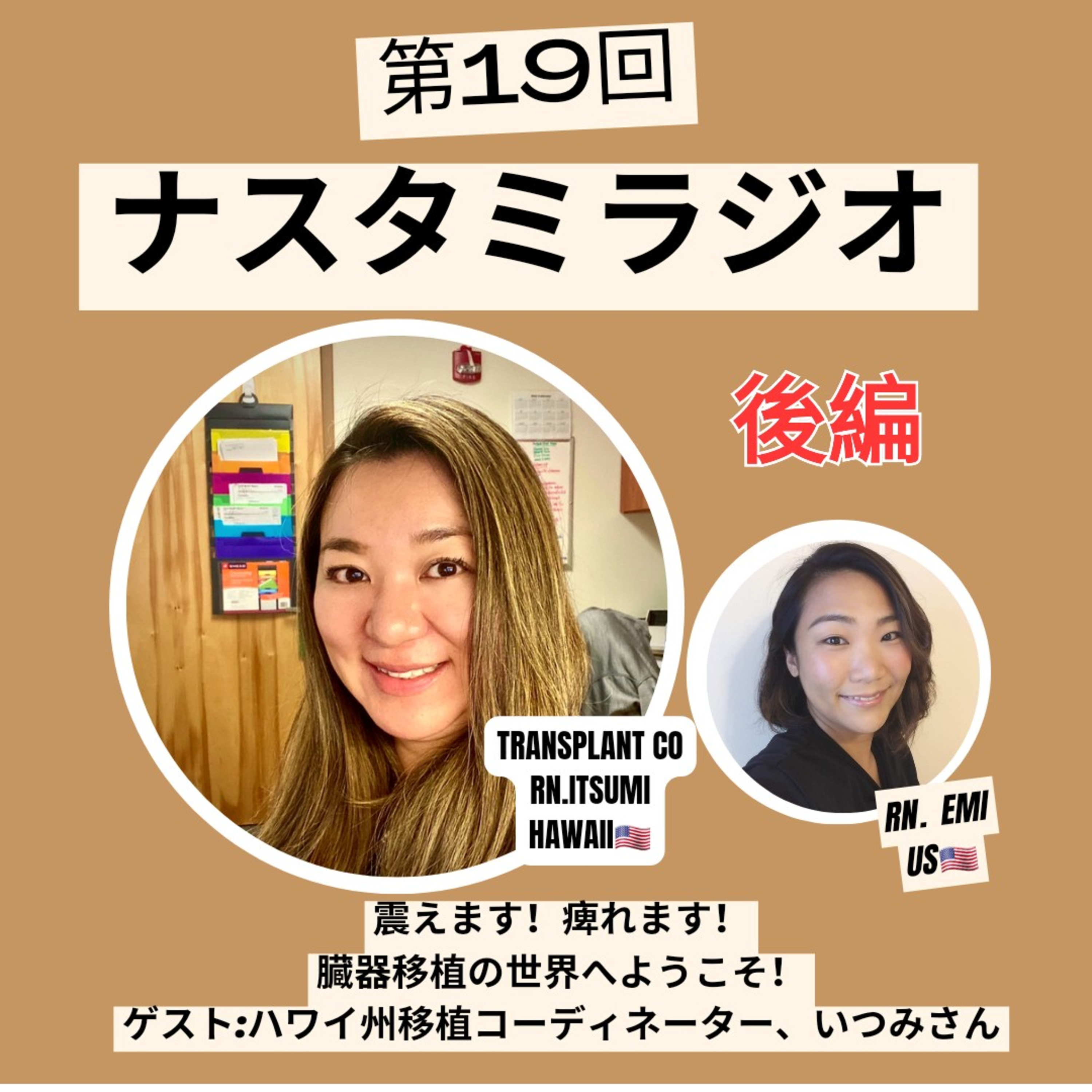 今回は前回のナスタミラジオ第19回、前編に引き続きハワイ州、移植コーディネーターのいつみさんとのお話をお届けします。前回は移植って、移植コーディネーターってどんなもの?という内容でしたが、後編では実際の仕事内容、葛藤など、そして日本の移植事情と課題などを中心に臓器移植の世界をさらに深く触れる回となっています。