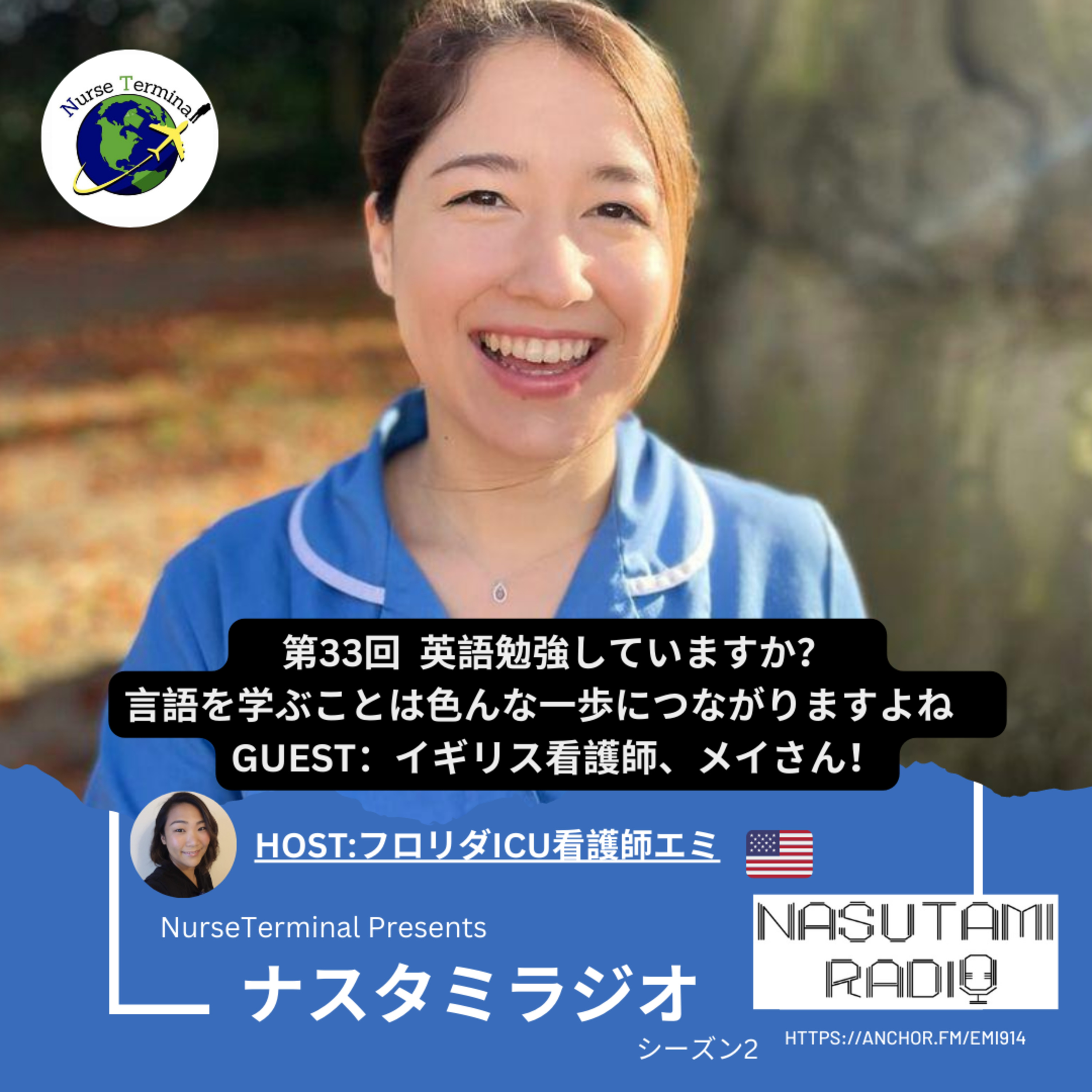 ナスタミラジオ第33回は、イギリスの看護師、そして英語講師としても活躍するメイさんをゲストにお送りします。言語を学ぶということは楽しいというのと同時に自分との戦いなのではないでしょうか。完璧を求めれば進めないし、自信をつけるには沢山の失敗はついものだし、時にはプライドもズタズタになる事もあるんではないでしょうか。地道に練習して、ちょっと勇気を出して一歩踏み出してみる。そこには自分の知らない世界が広がっていて。またちょっと頑張ってみる。そんな経験は色んな挑戦のカタチにも似ている気がします。