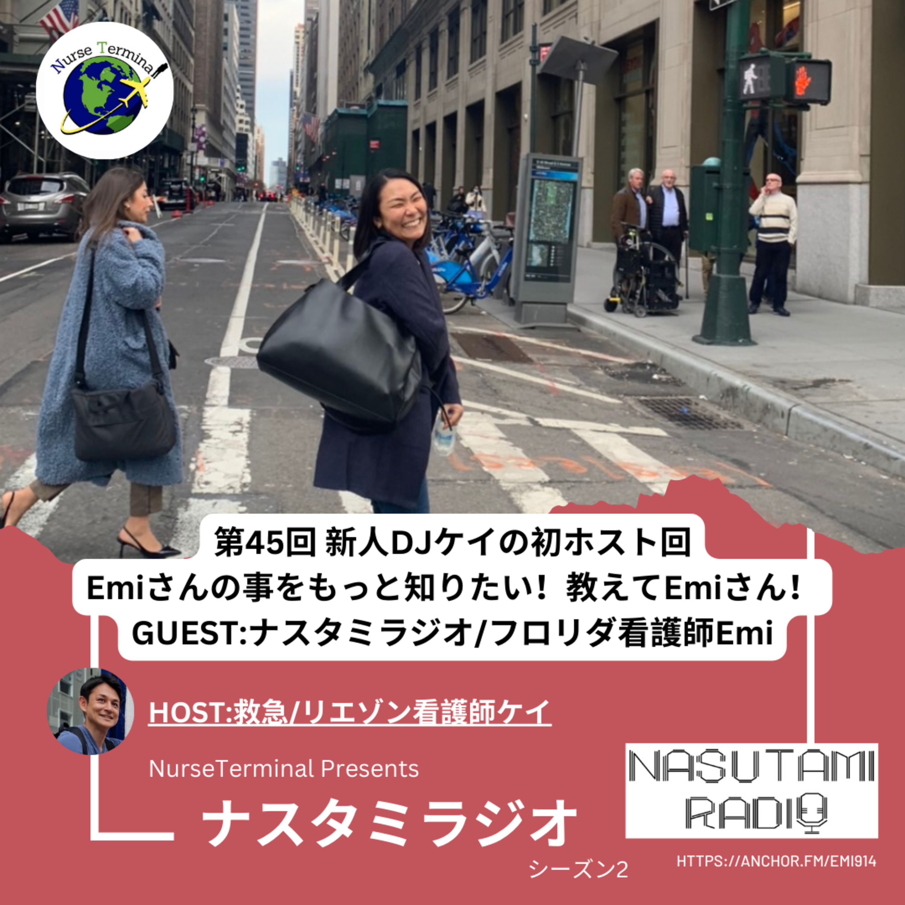 エピソード前半では、外国語大を出て看護師になられたEmiさんの、日本での臨床経験を経てアメリカに飛び立った背景、アメリカで看護師資格取得、現地での生活や2人のお子さんにまつわるエピソードを探ります。また後半では、Emiさんが始められたこのナスタミラジオというコンテンツ誕生の秘話、ナスタミラジオへの想い、今後のビジョンなどを語っていただきます。