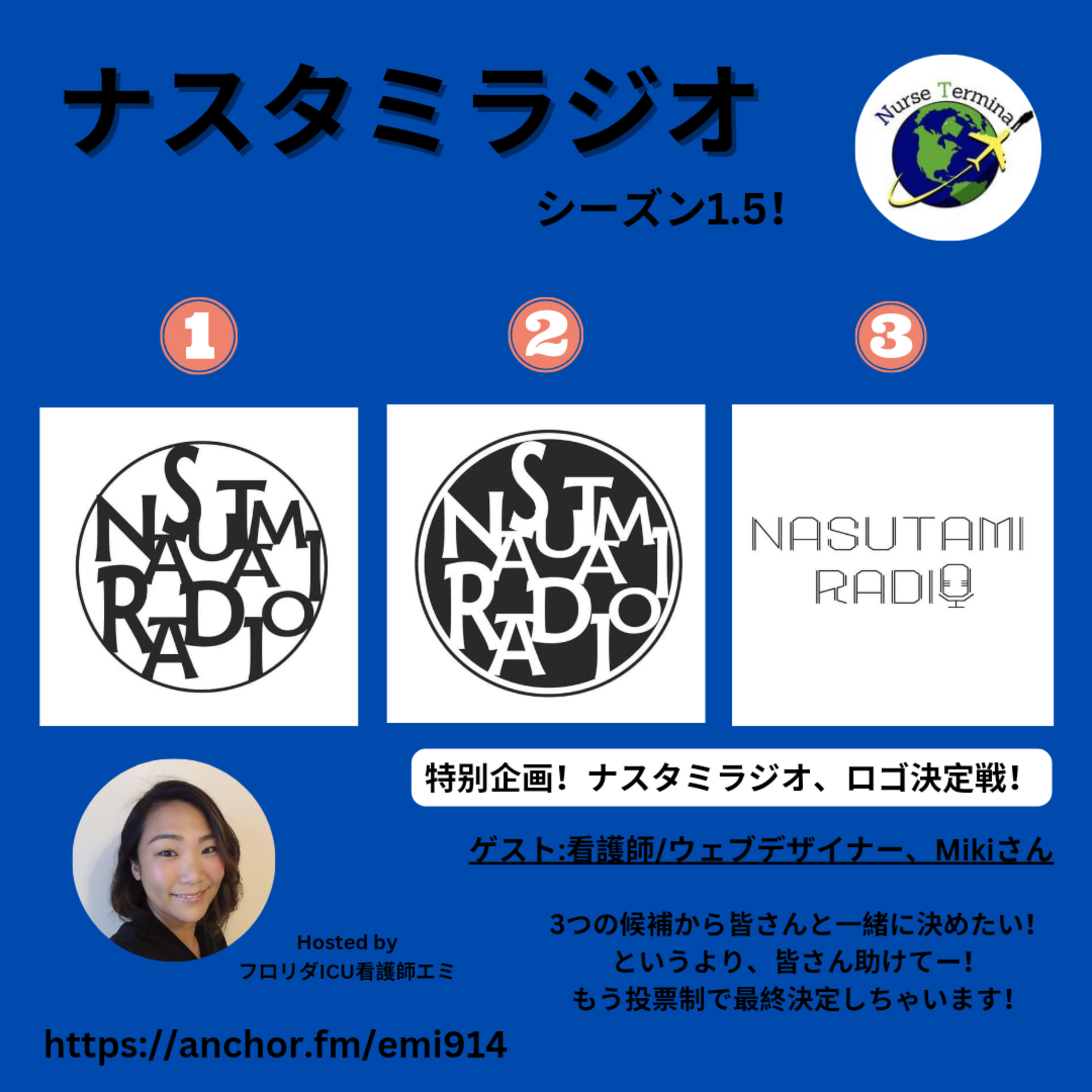 ナスタミラジオ、シーズン2配信開始直前、特別企画!ナスタミラジオのロゴ決定戦を開催します!去年の秋より始まったこのナスタミラジオ。当初よりメインパーソナリティー、エミはロゴにあこがれを持っていました。でもデザインという分野にど素人の私はなかなか決められなかった。ナスタミ運営メンバーの力をかり、そして素敵なアイディアとデザインを提供してくれる看護師であり、ウェブデザイナーのMIKIさんと共に沢山のディスカッションと想いを詰めて、ついに3っつの候補が決まりました。そして最後はナスタミラジオを応援してくれるリスナーの皆さんと一緒に決めたい!という想いにかられ、投票制!ロゴ決定戦を開催したいと思います!