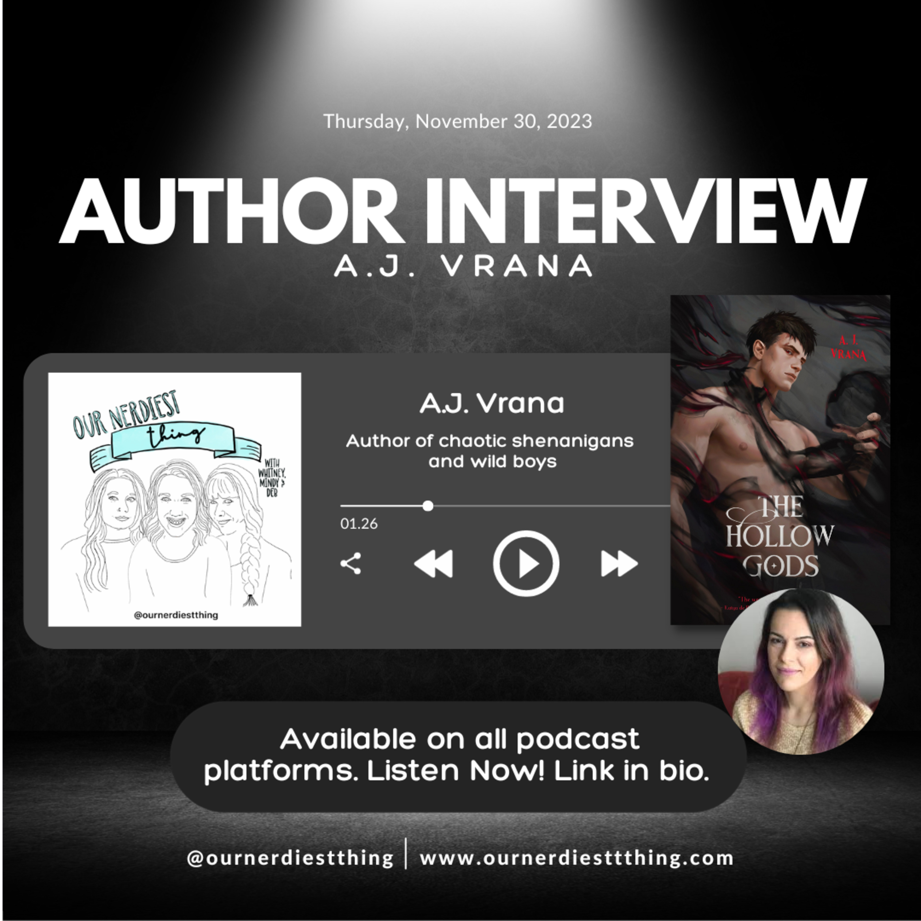 Listen in for our chat and then gGo check out A.J.’s Chaos Cycle Duology and and preorder their upcoming novel, Wildblood. And be sure to follow A.J. at a.j.vrana